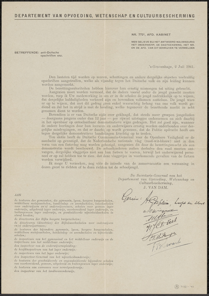 Brief van het Departement van Opvoeding, Wetenschap ...
