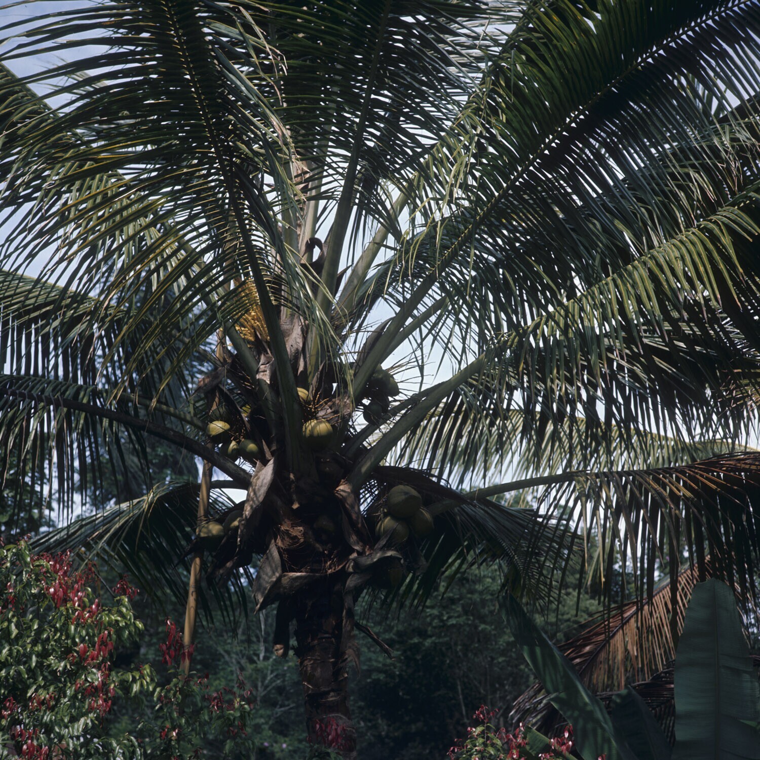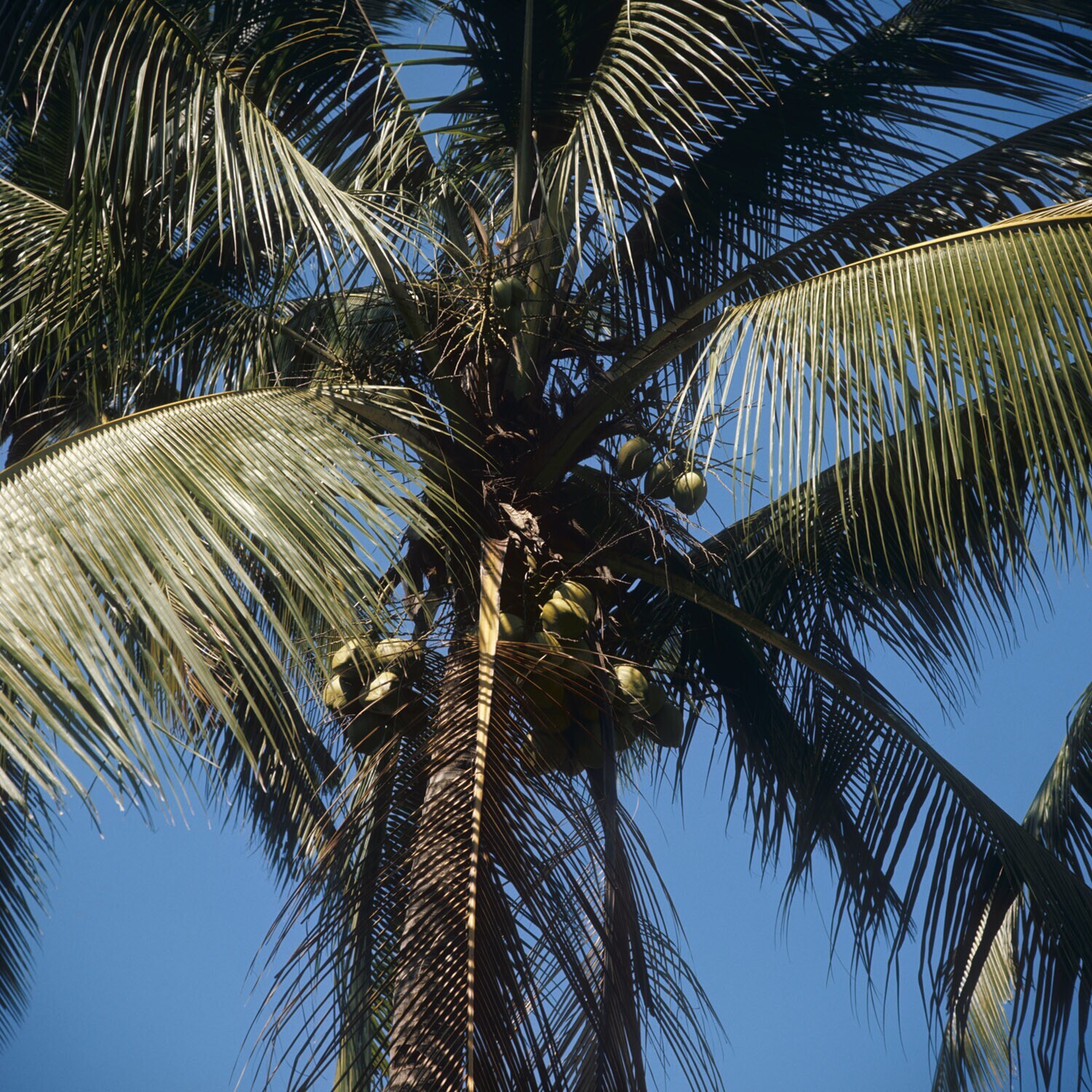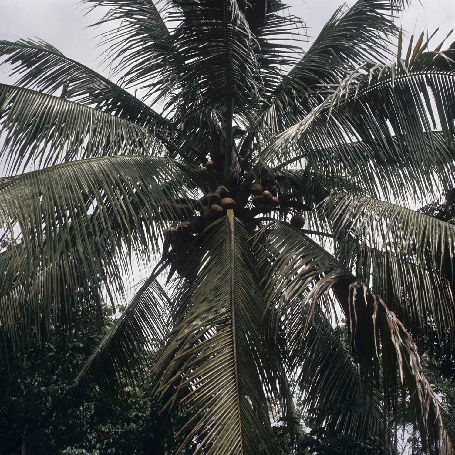 Kruinen van cocospalmen