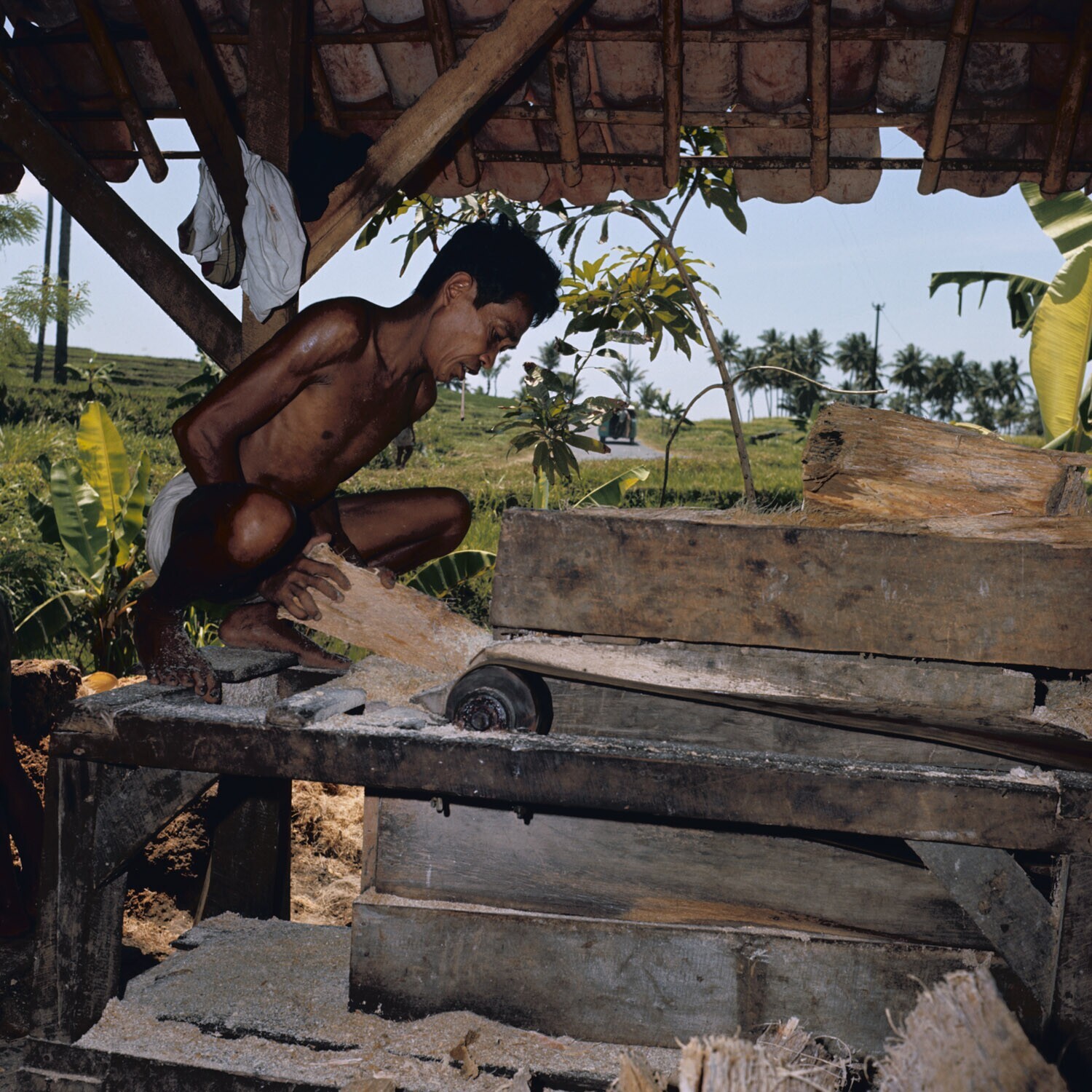 Sagopalmstam wordt in stukken gehakt, Java