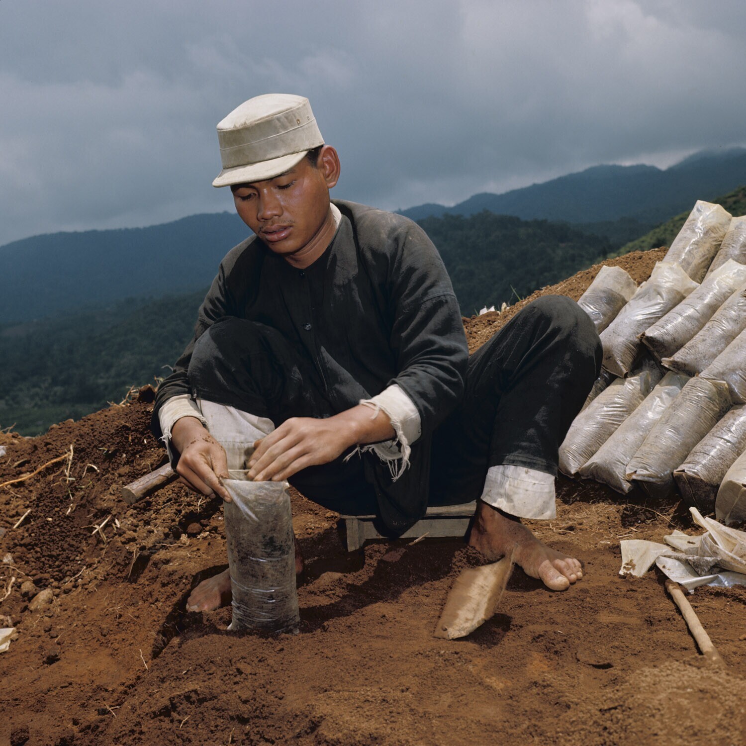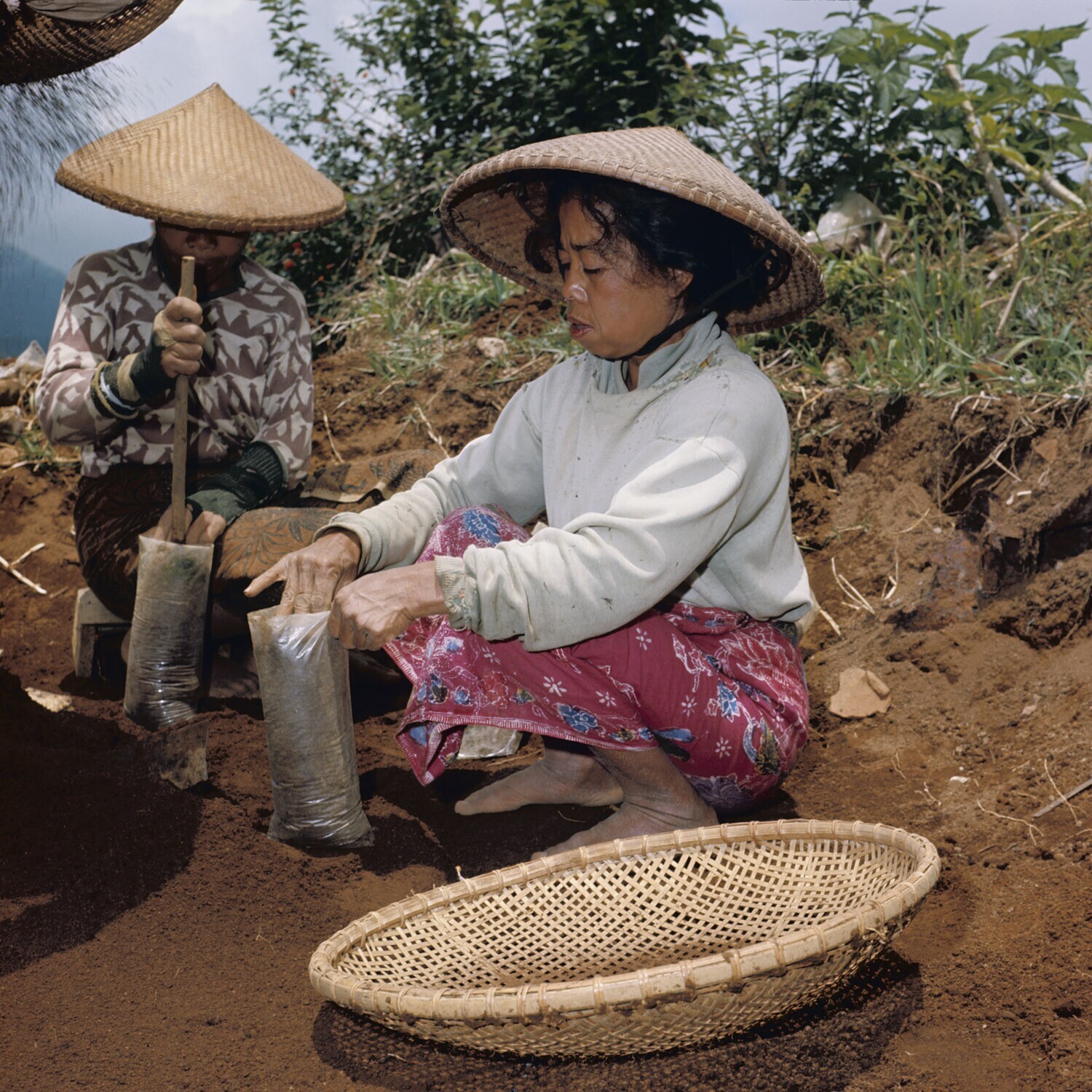 Zakjes worden gevuld met humusrijke grond