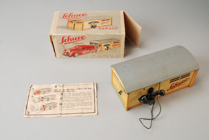Gele blikken speelgoedgarage van "SCHUCO", model 150...