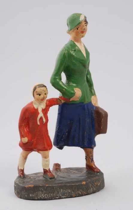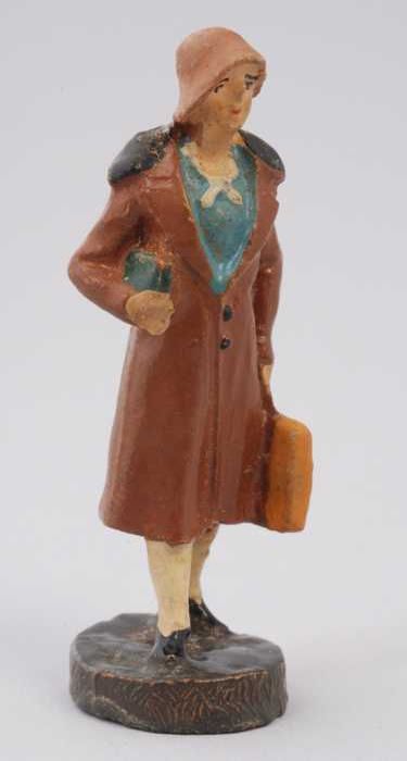 Beschilderde figuurtje: vrouw in bruine kleding, kof...