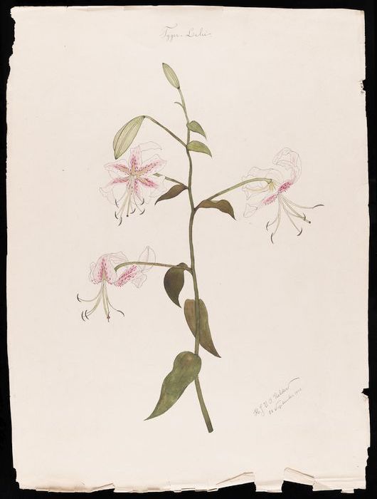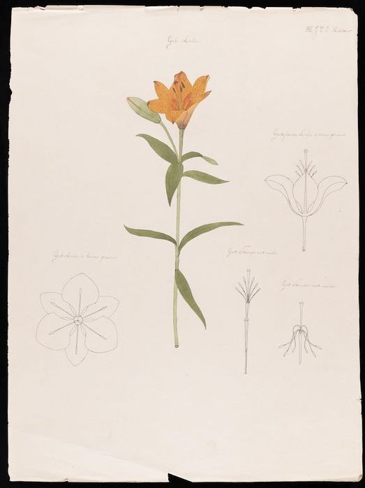 Tekeningen van een tijgerlelie, in inkt en aquarel o...