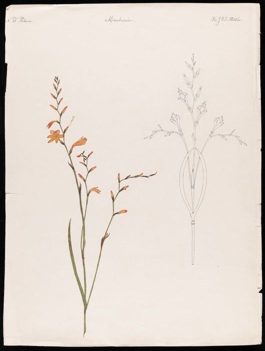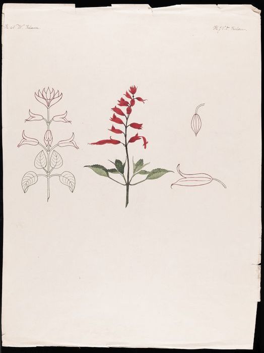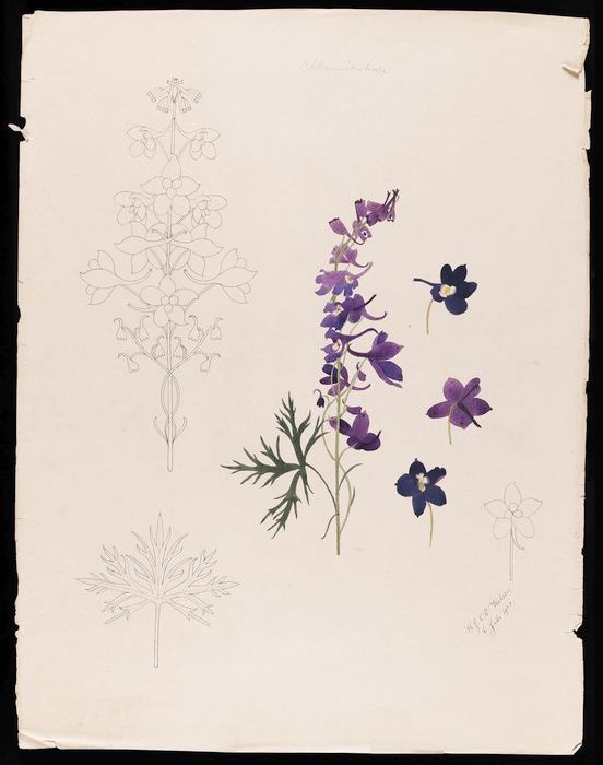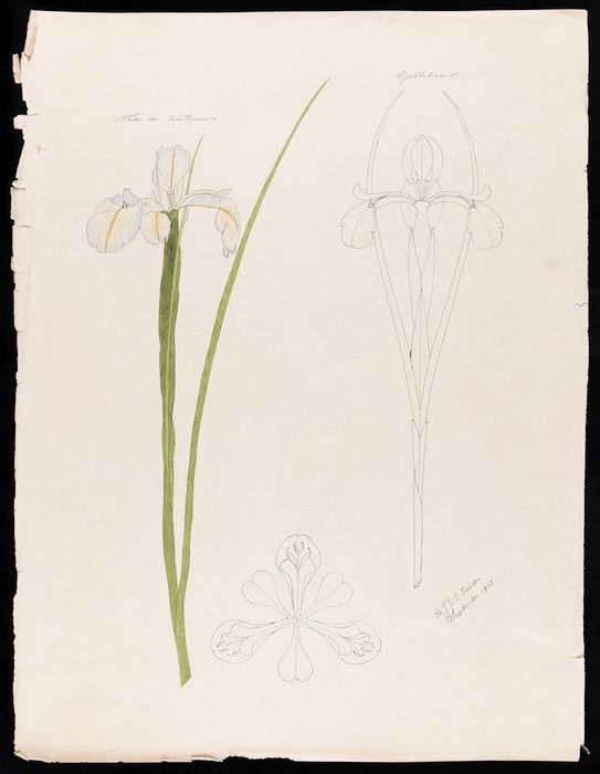 Drie tekeningen van een iris en gestileerde details,...