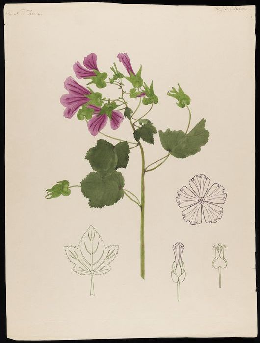 Vijf tekeningen van kaasjeskruid en gestileerde deta...
