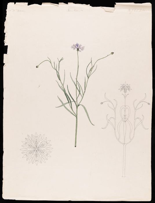 Drie tekeningen van een korenbloem en gestileerde de...