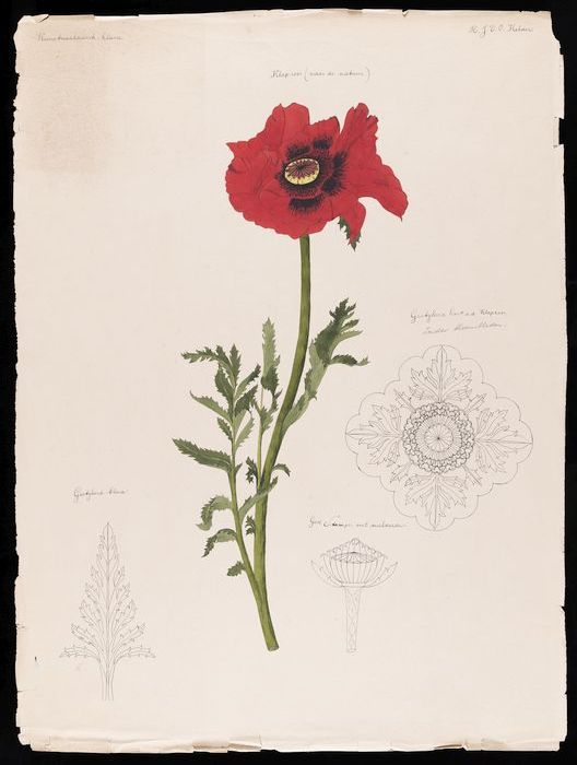 Vier tekeningen van een klaproos en gestileerde deta...