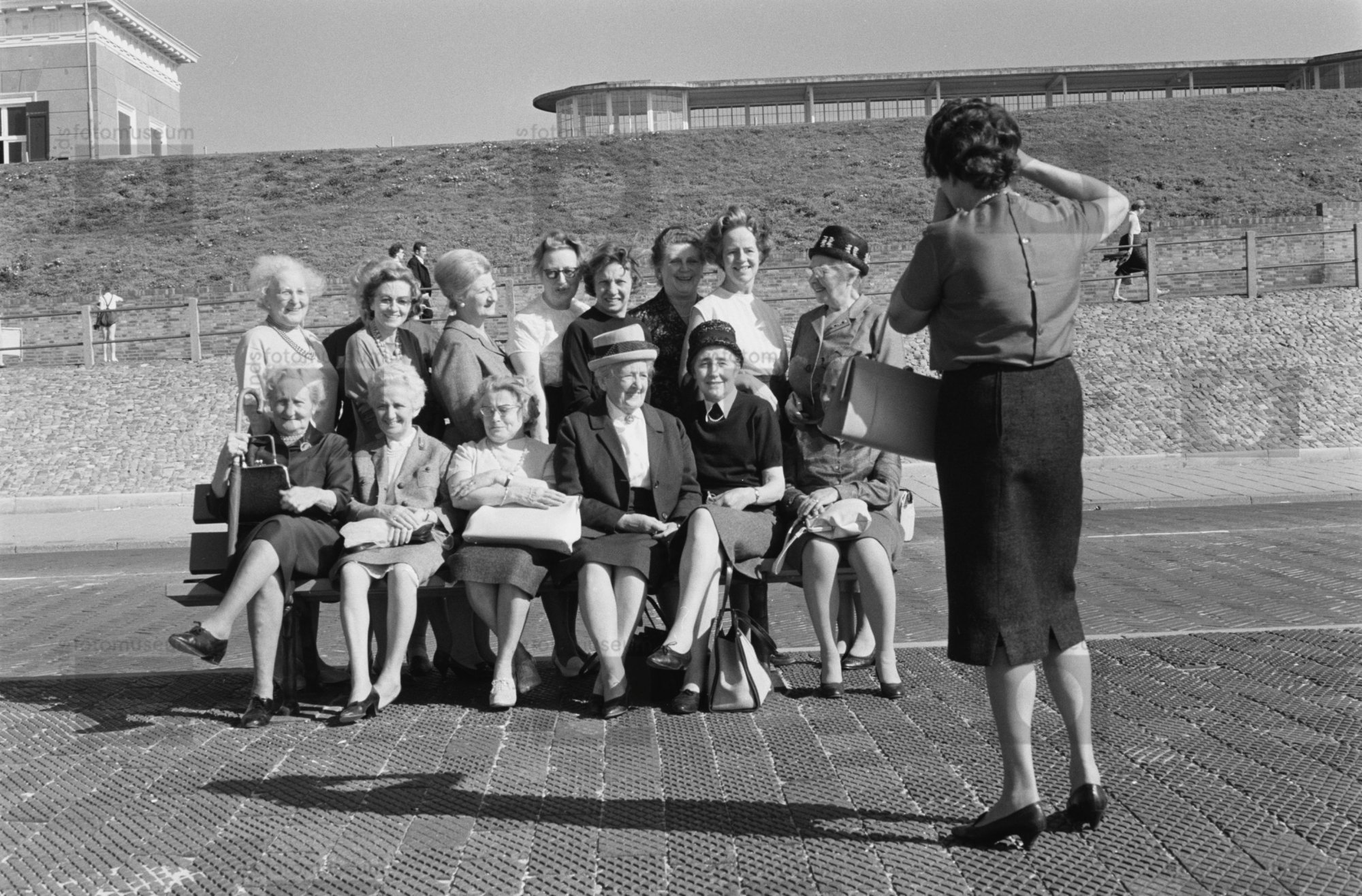 Scheveningen op de boulevard. Vrouw maakt een groeps...