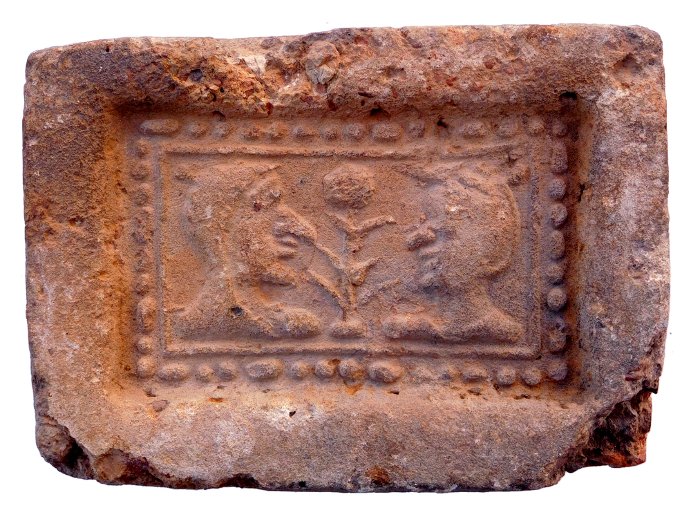Haardsteen met daarop twee koppen en een bloem
