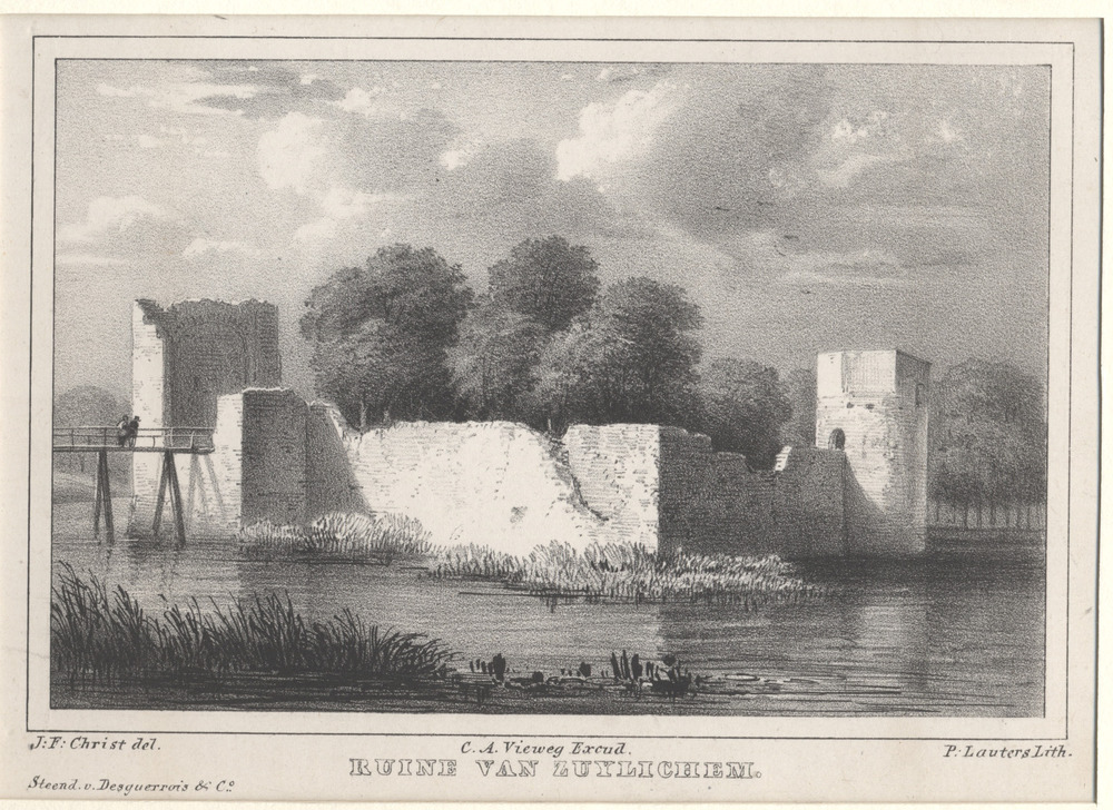 Gezicht op de ruïne kasteel Zuilichem met brede grac...