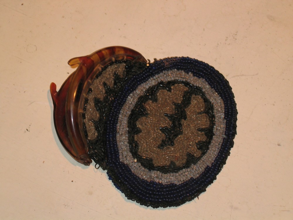 Beursje van kraaltjes, blauw zwart en beige met plas...