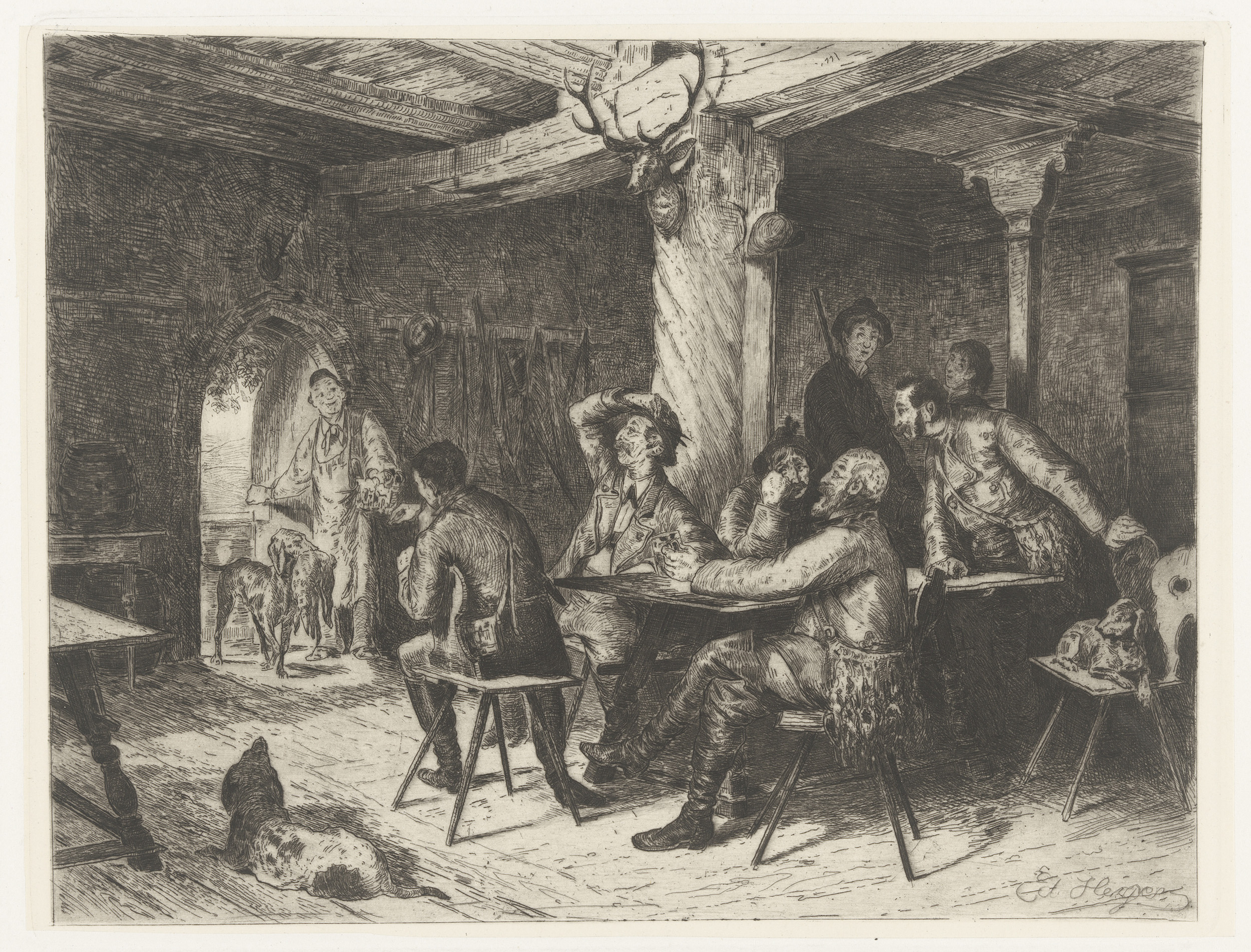 Herbergscène met een groep drinkende jagers