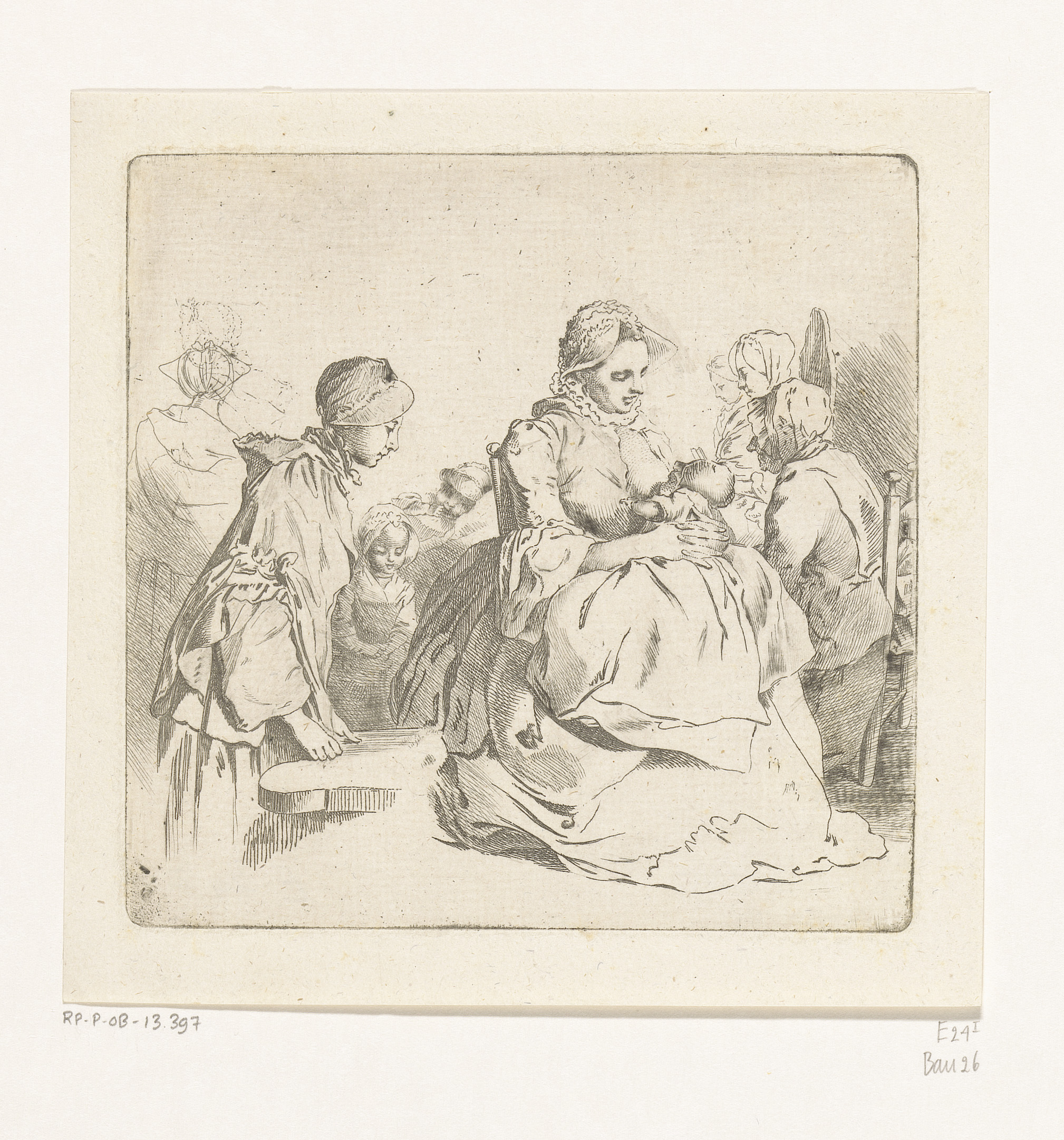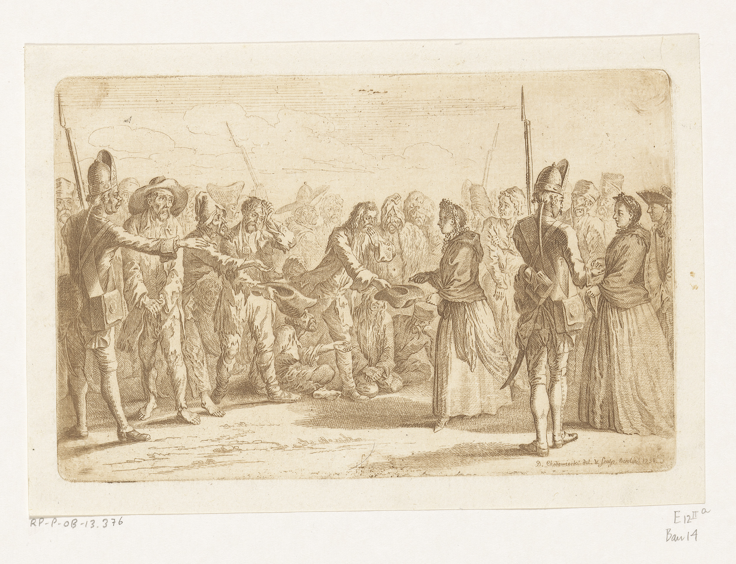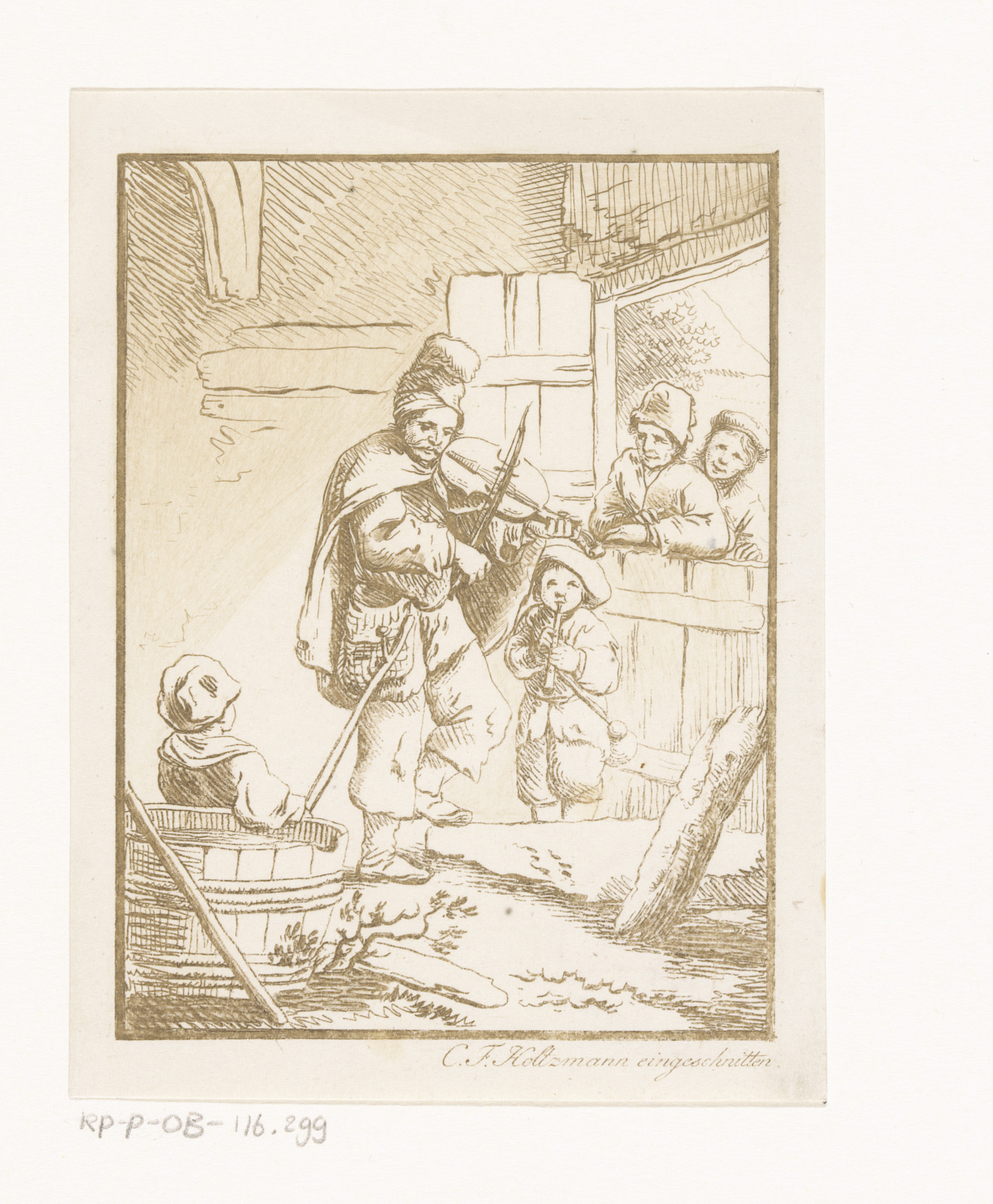 A blind hurdy-gurdy player and family receiving alms