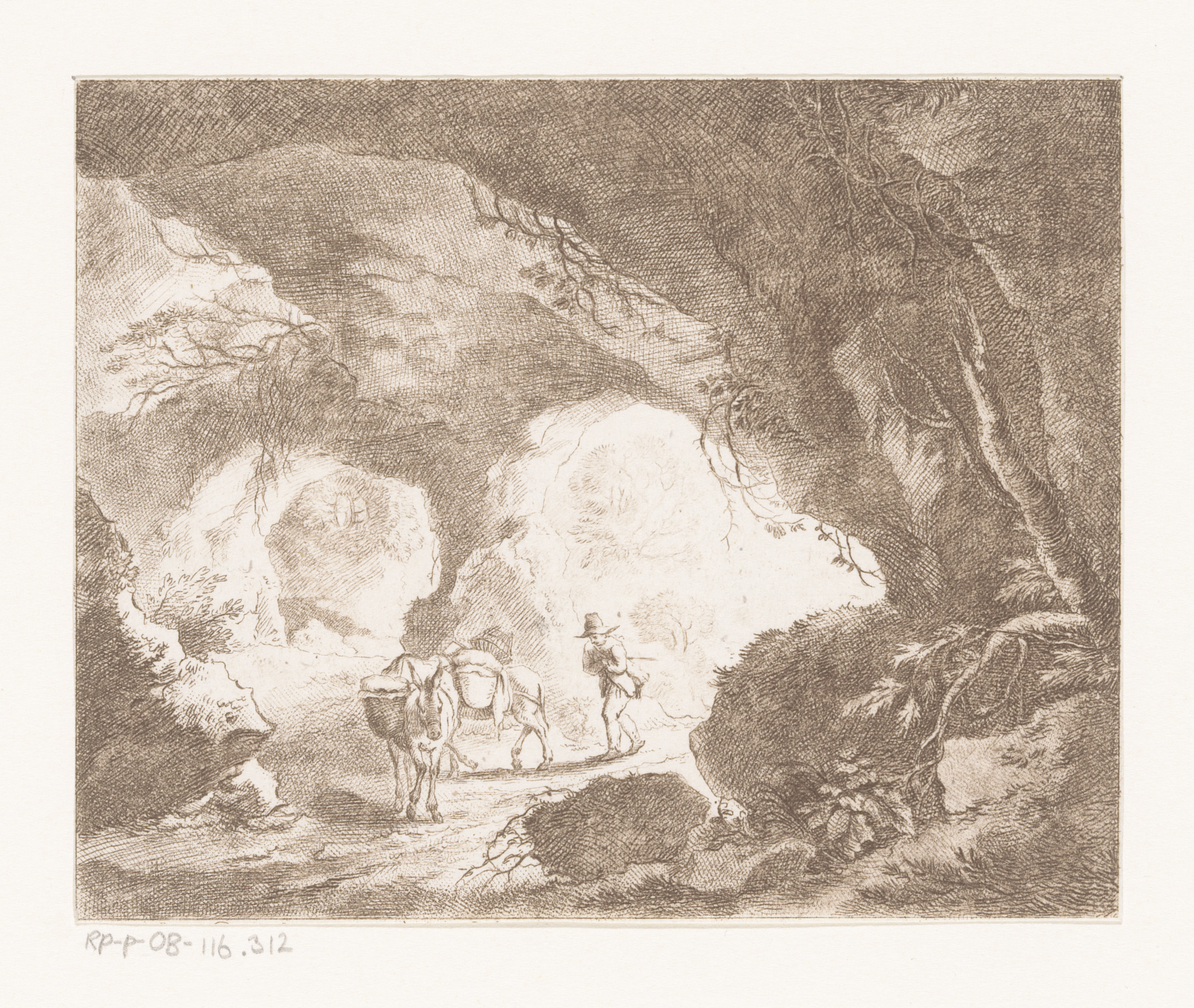 Reiziger met twee ezels in een grot