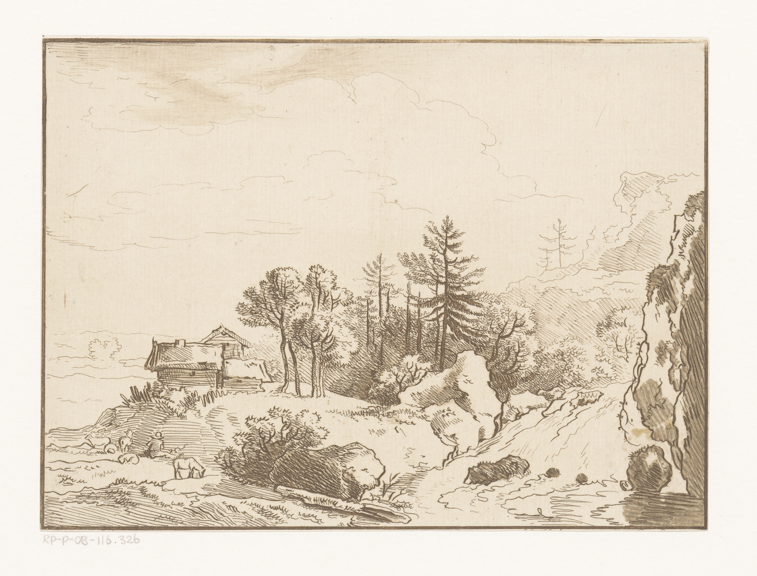 Heuvellandschap met herder bij een hut en waterval