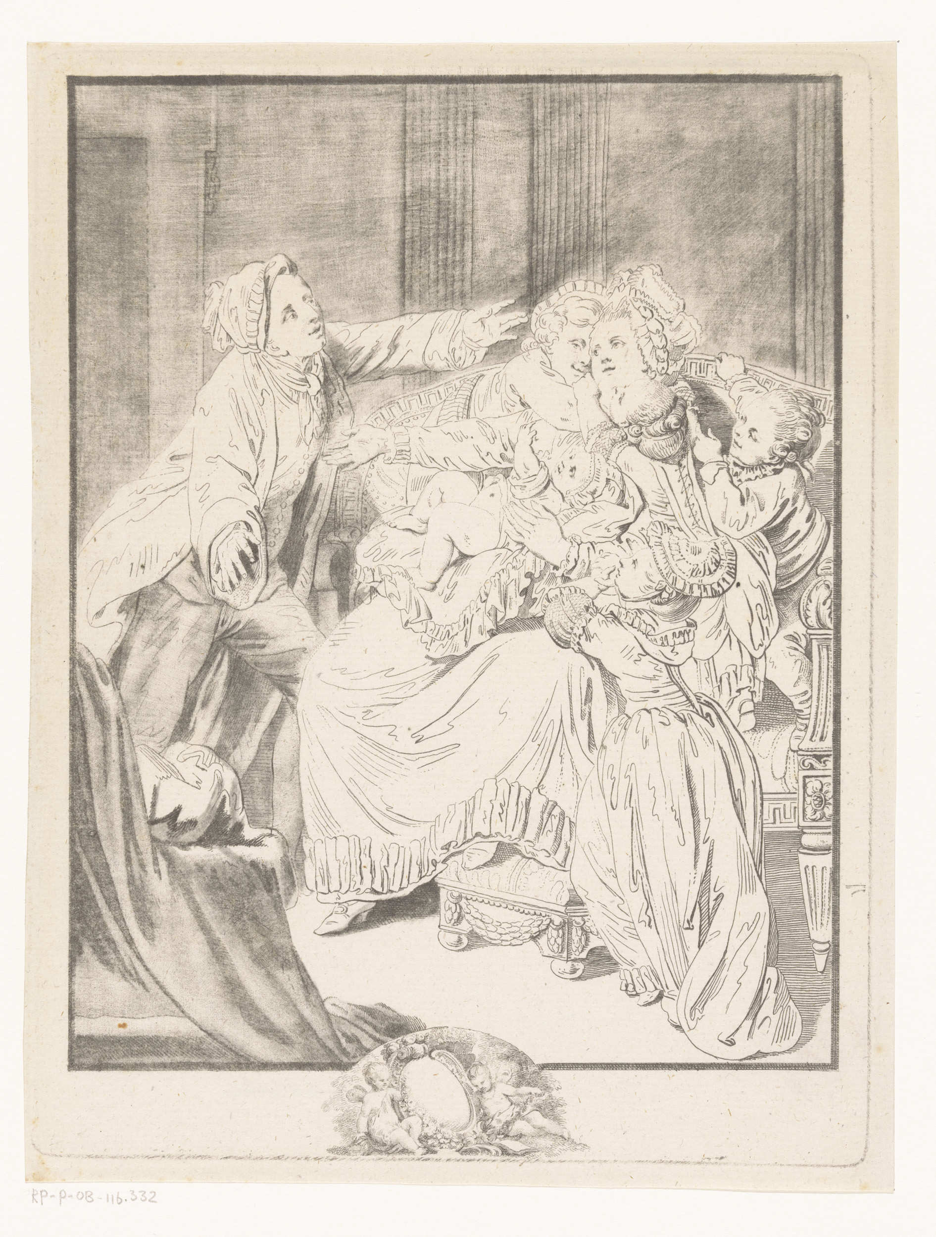 Vrouw op een bank omringd door vijf kinderen en toes...