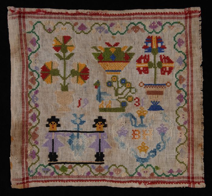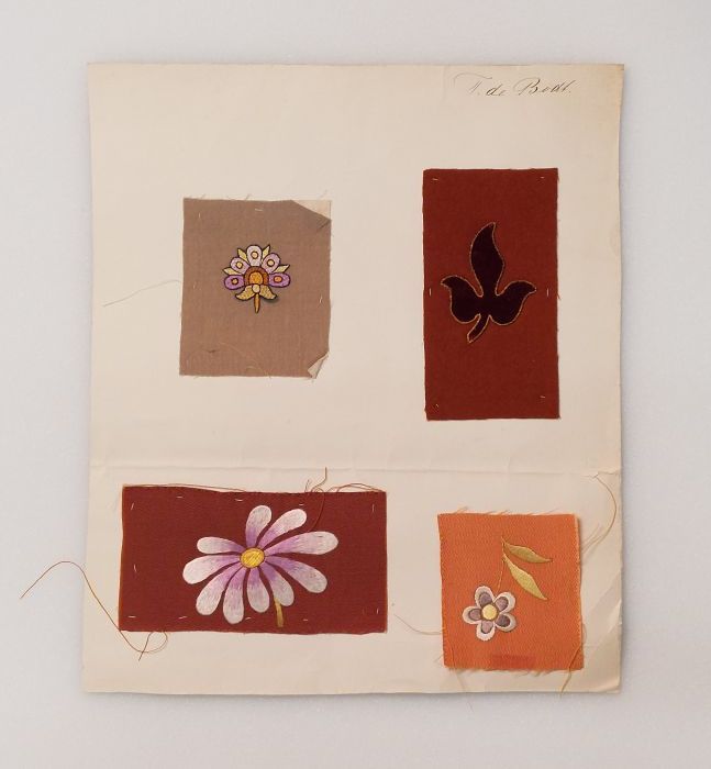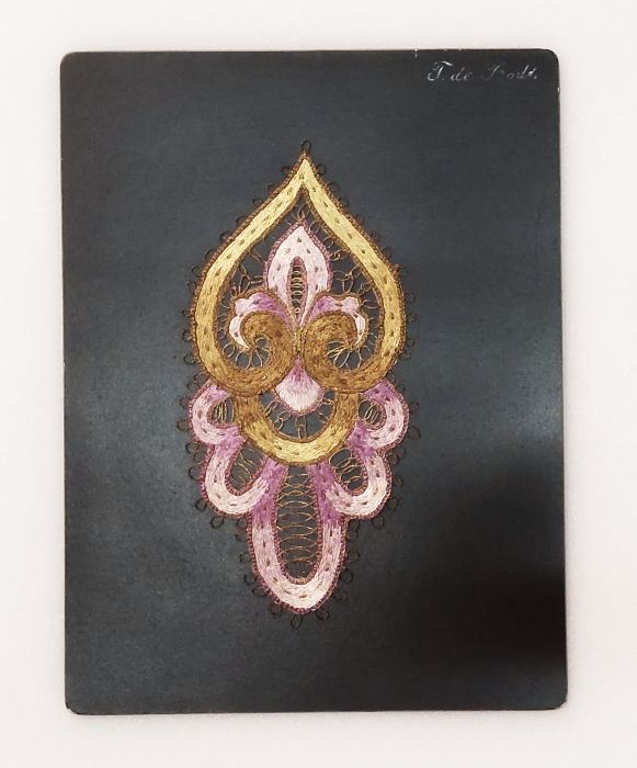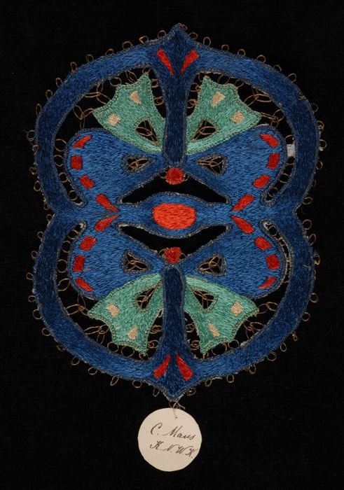 Proefstuk, ornamentele applicatie geborduurd met gro...