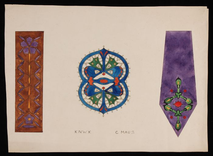 Ontwerptekening, drie ontwerpen in zwarte inkt en ge...