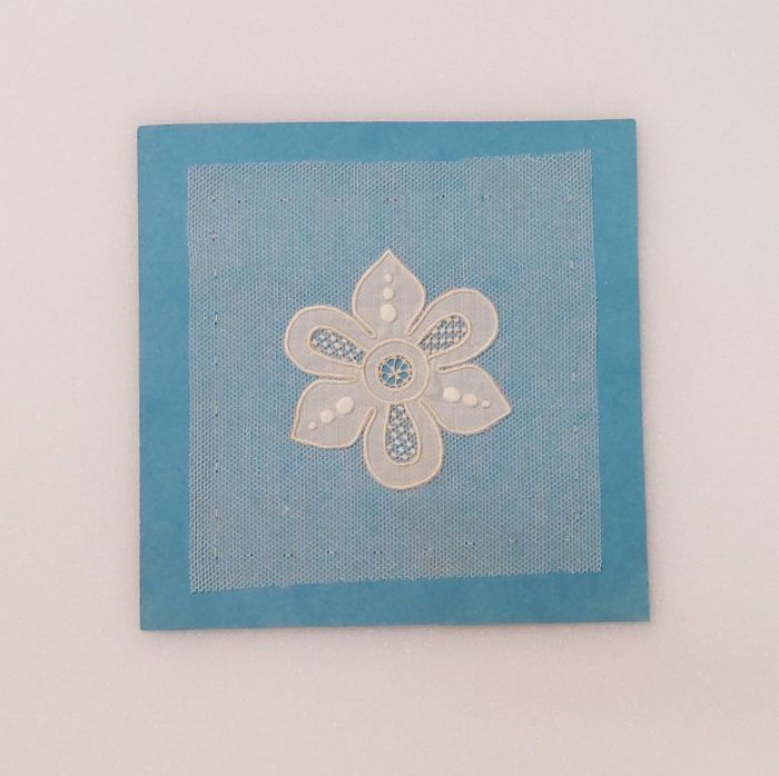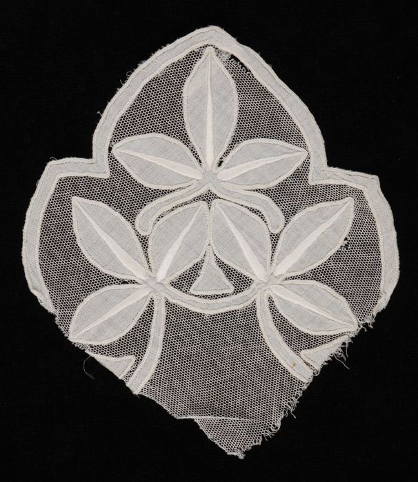 Proefstuk bloemvormige applicatie van wit batist op ...