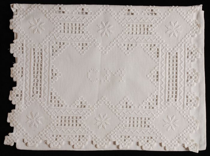 Stekenlap in open naaiwerk in wit linnen en gekleurd...