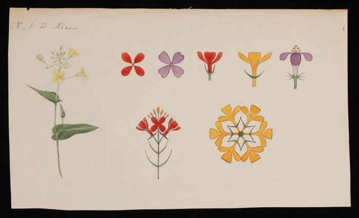 Ontwerptekening, drie bloemen in zwarte inkt en gekl...