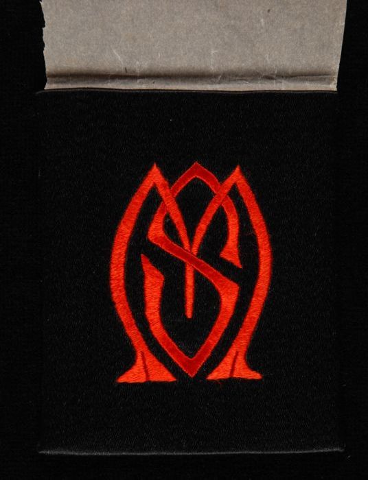 Geborduurd monogram "MS" in platsteek met rode zijde...