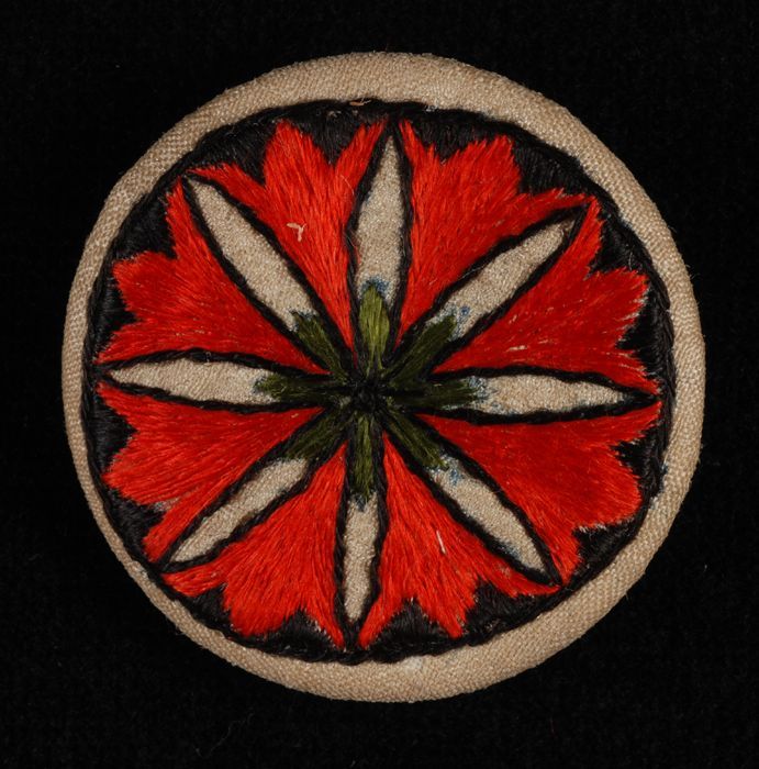 Ronde broche met geborduurd ornament in rood en zwar...