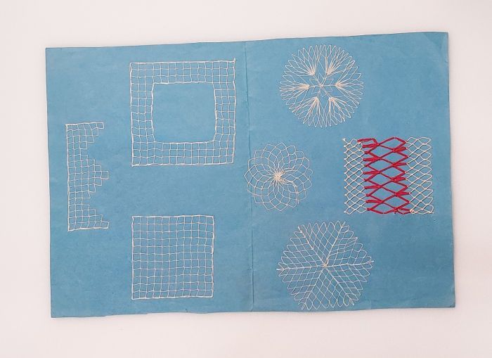 Proefstuk Hedebowerk in fijn wit katoen vastgezet op...