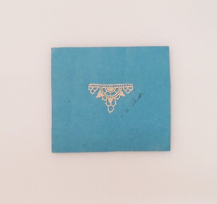 Letterlap gewerkt in blauwe zijde in platsteek op cr...