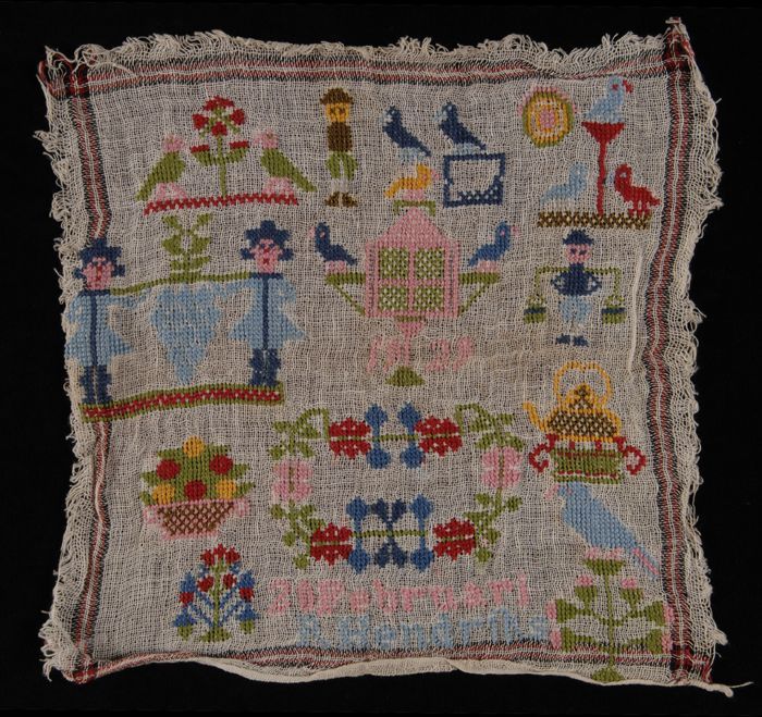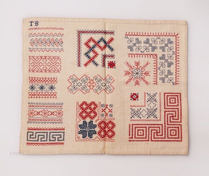 Stekenlap in Holbeintechniek geborduurd in rood en b...
