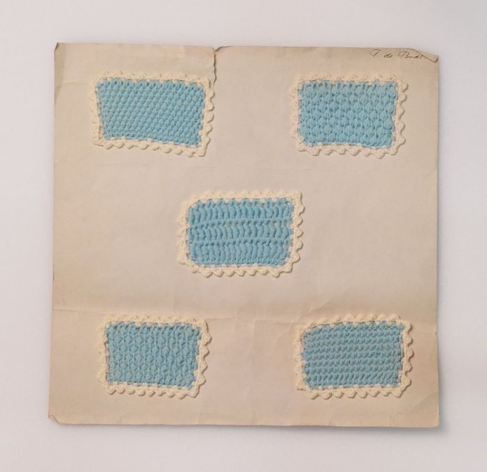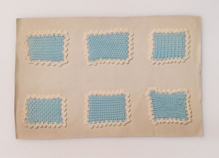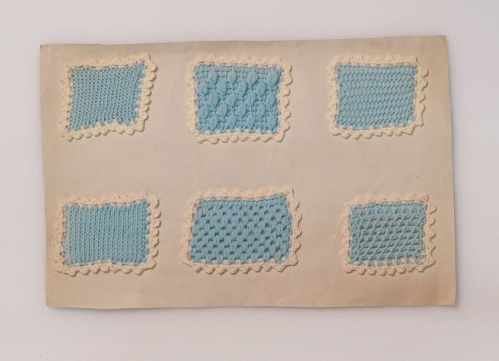 Zes proefstukken tunisch haakwerk (?) in witte en bl...