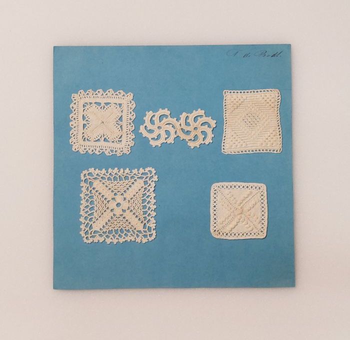 Zeven proefstukken frivolitè in fijn wit katoen vast...