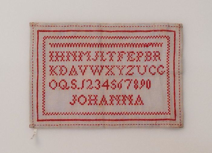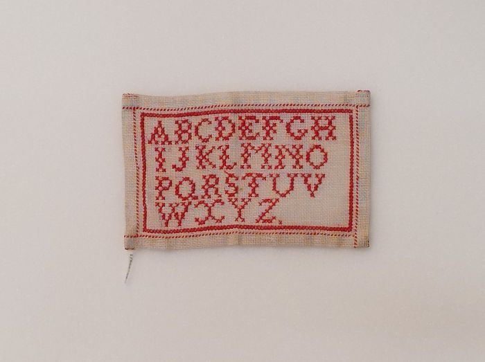 Letterlap gewerkt in wit katoen in platsteek op wit ...