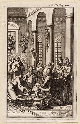 Voetwassing van reizigers in een klooster te Jeruzalem