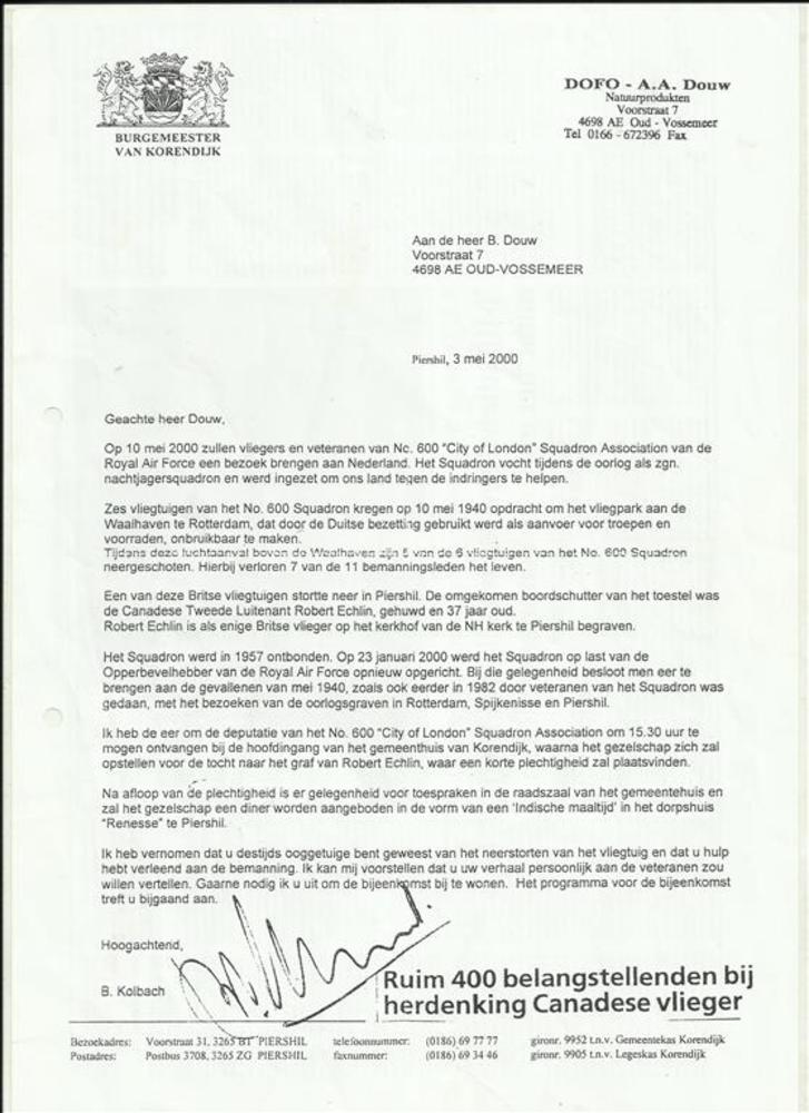 Brief van de burgemeester van Korendijk aan dhr B.Do...