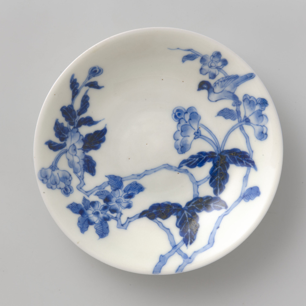 Japans schoteltje met bloeiende takken en vogels