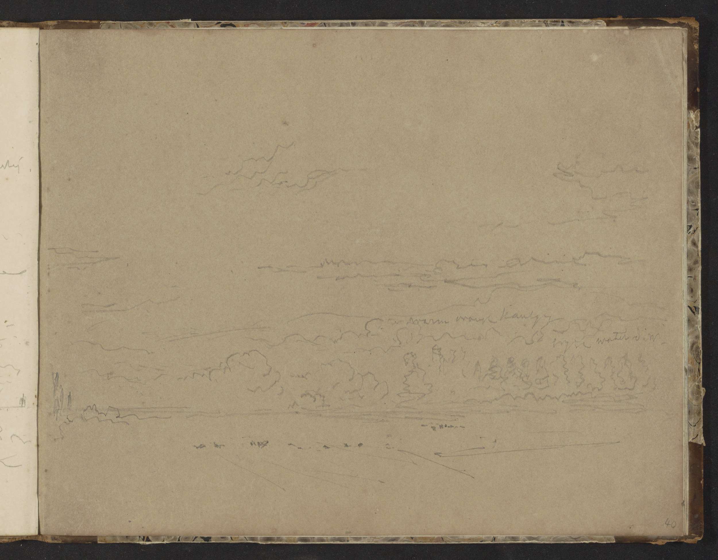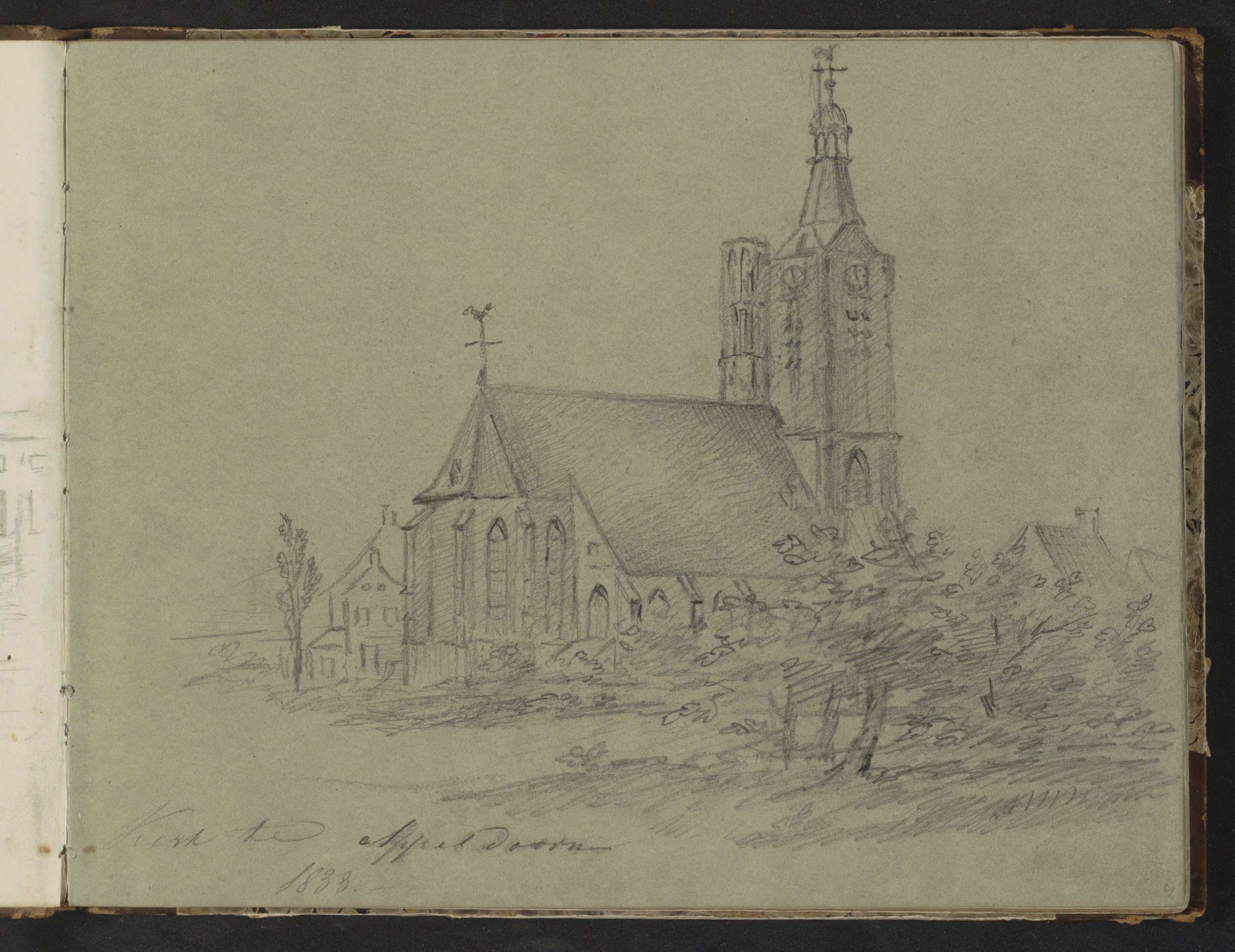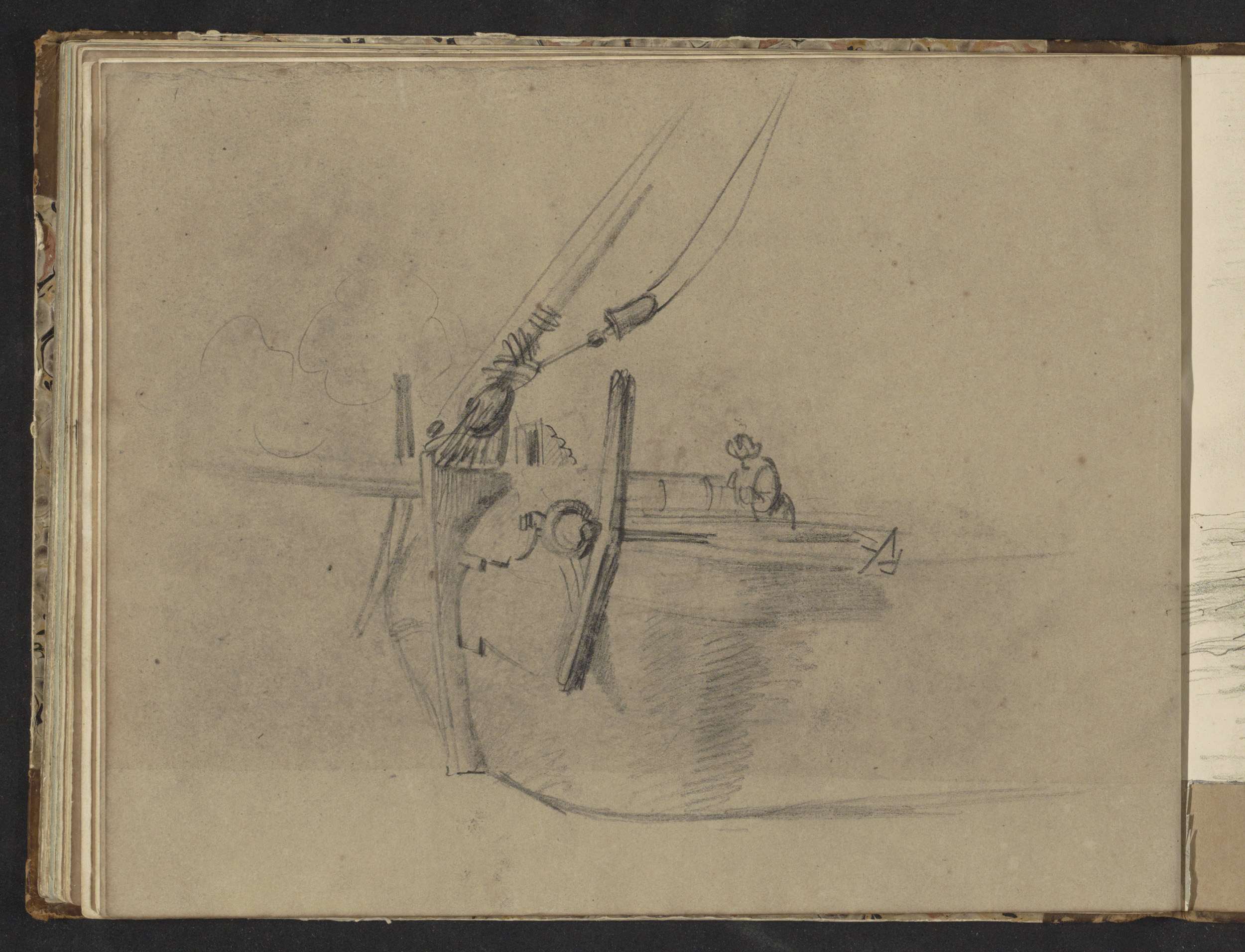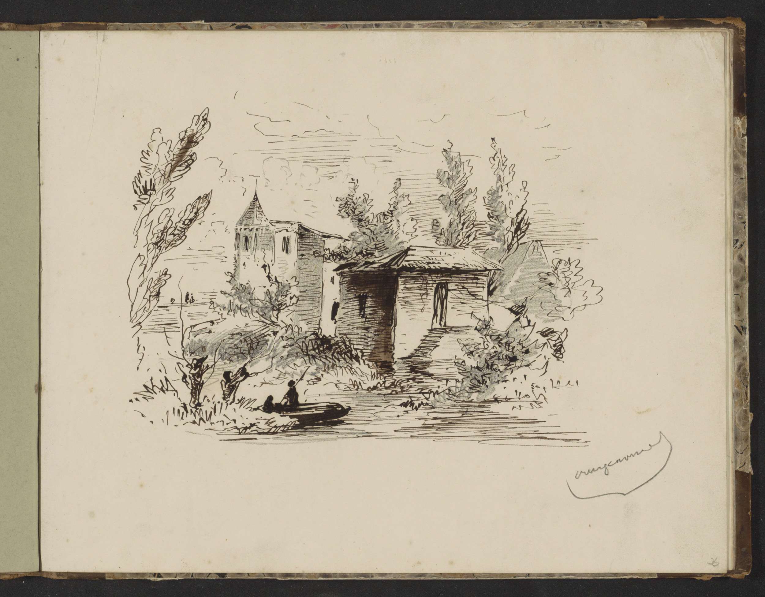 Figuren in een roeiboot op een rivier bij een kerktoren