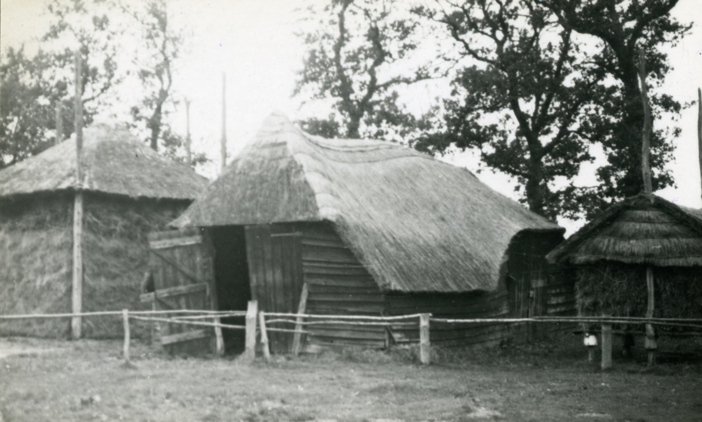 Hooibergen en schuur, Hierden, 1934 (zwart-wit foto)