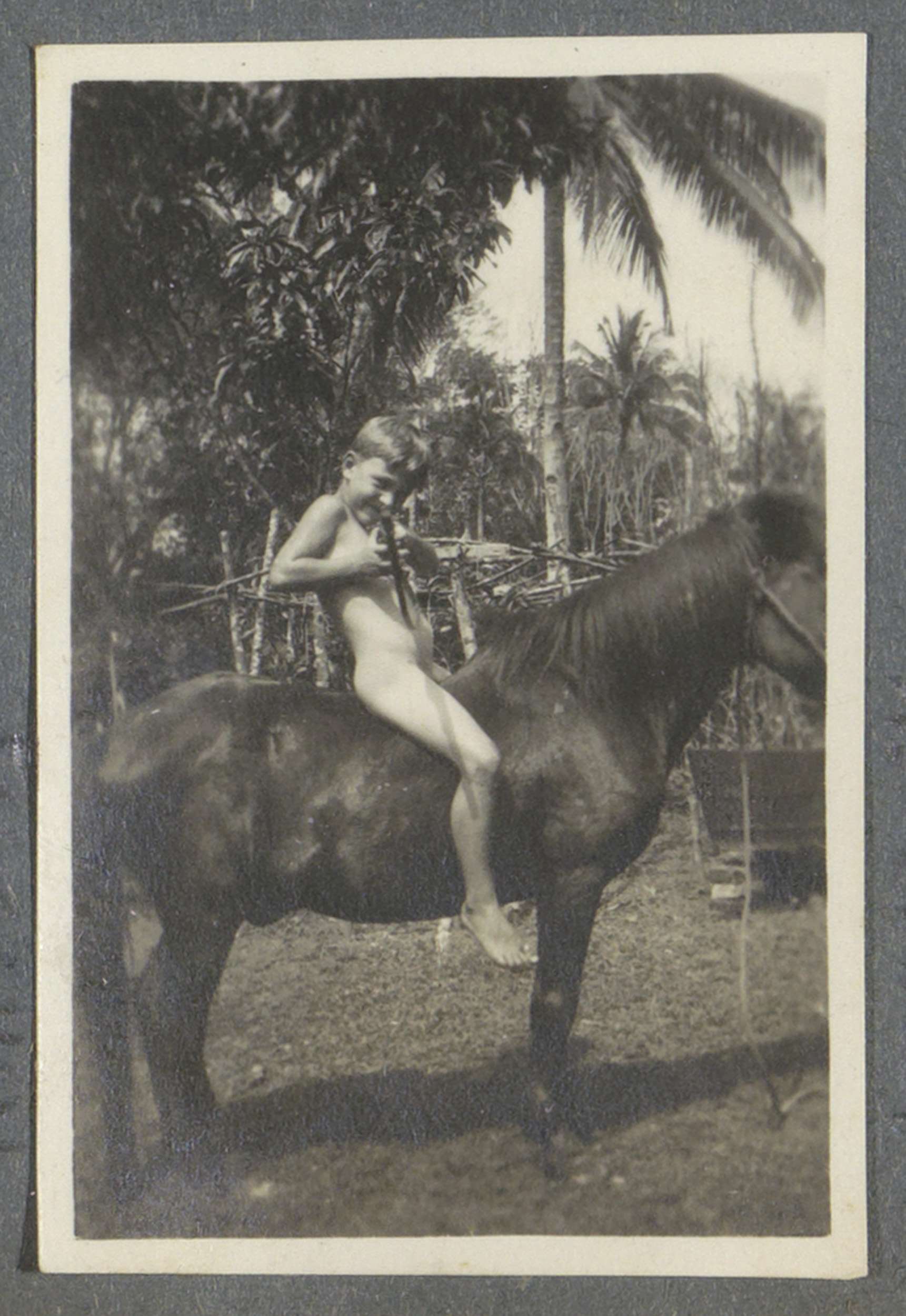 Naakte jongen te paard op Sumatra, vermoedelijk kind...