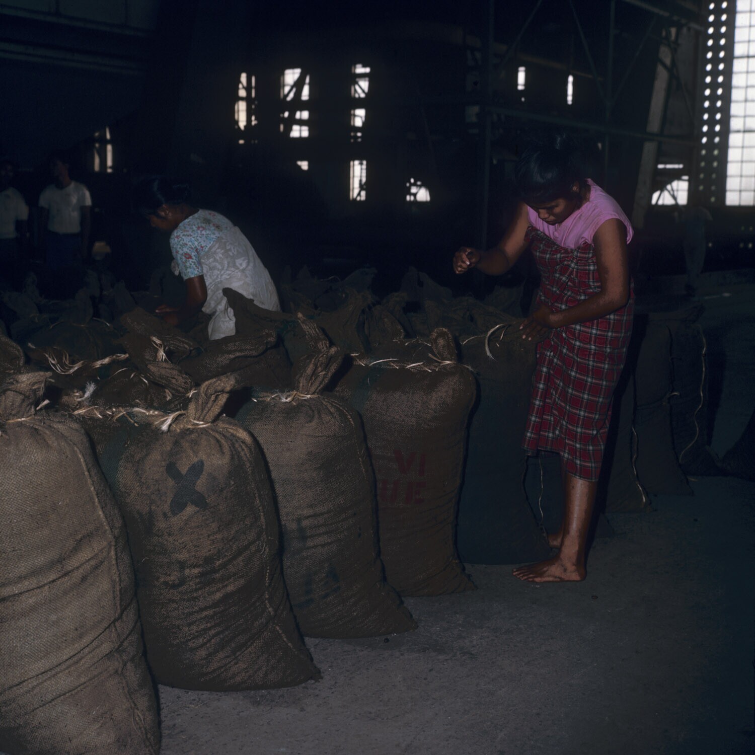 Het dichtnaaien van zakken met oliepalmpitten, onder...