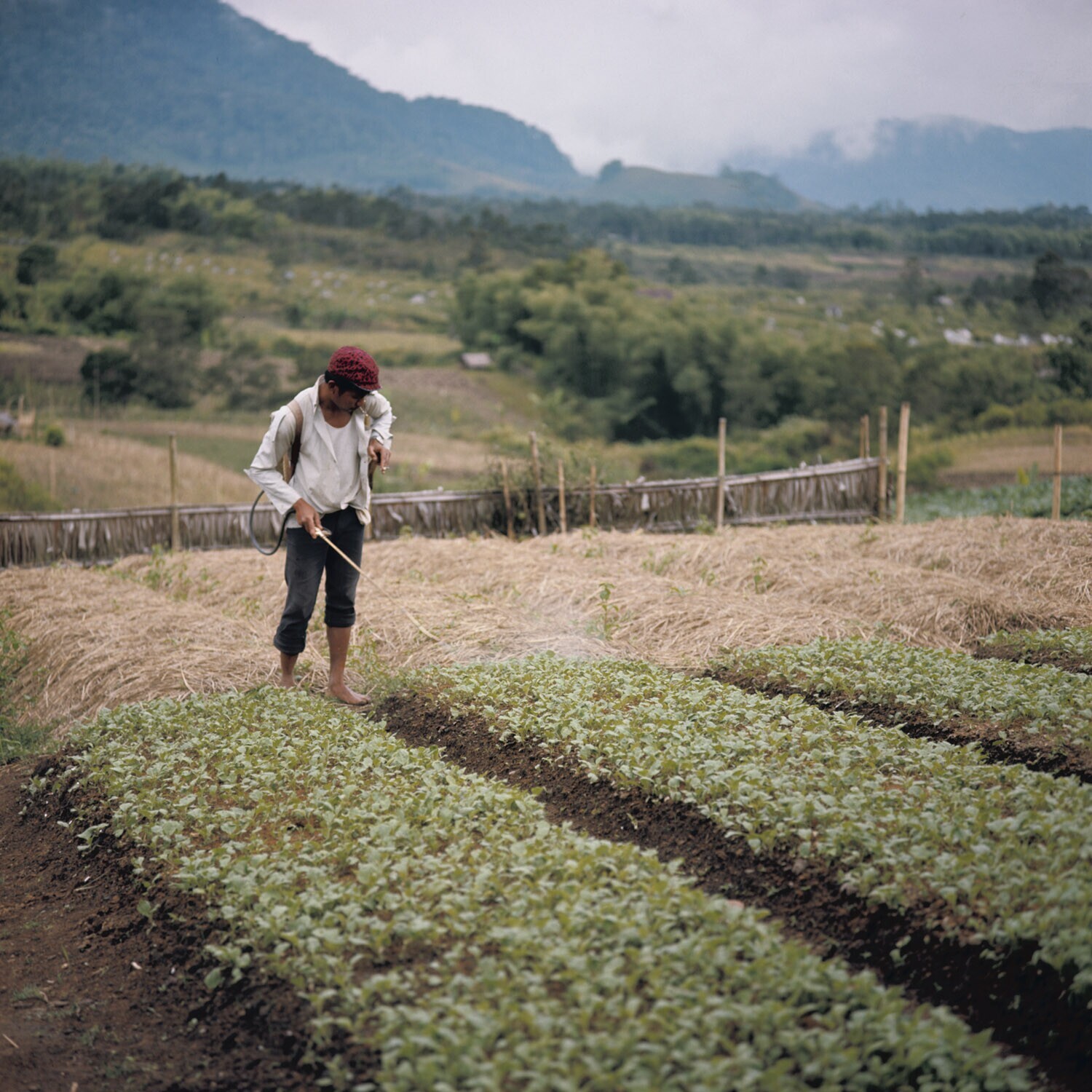 Bespuiting van Sawi-velden. (Brassica juncea Coss., ...