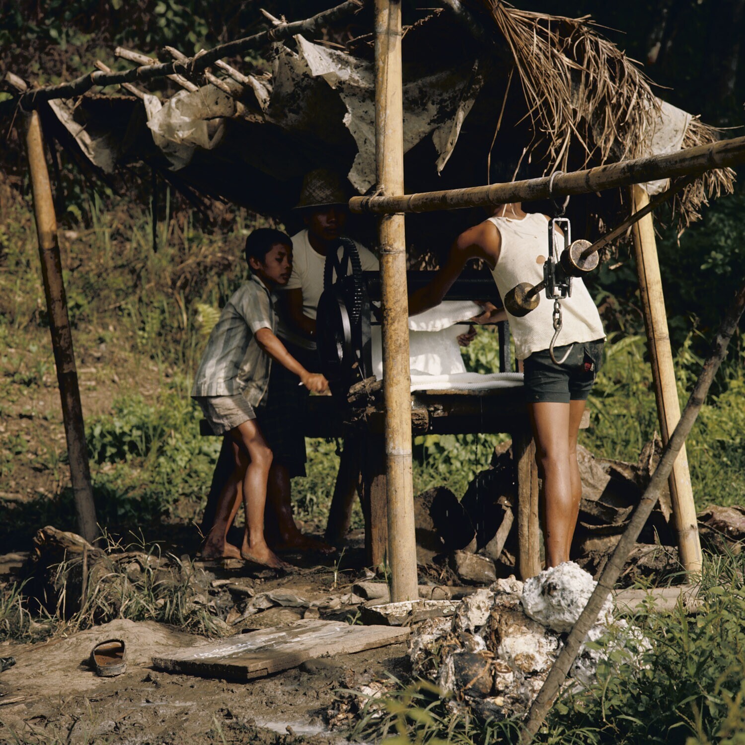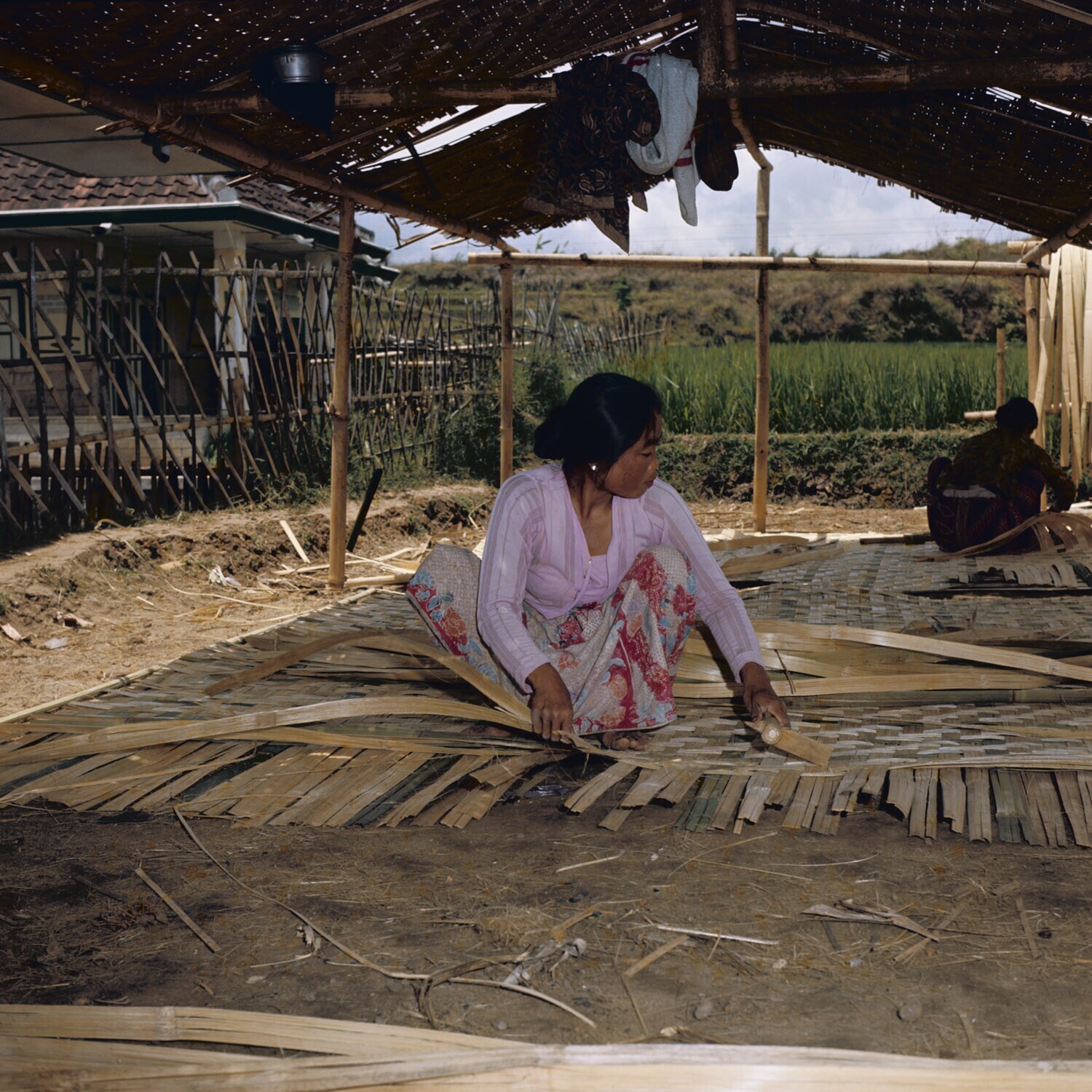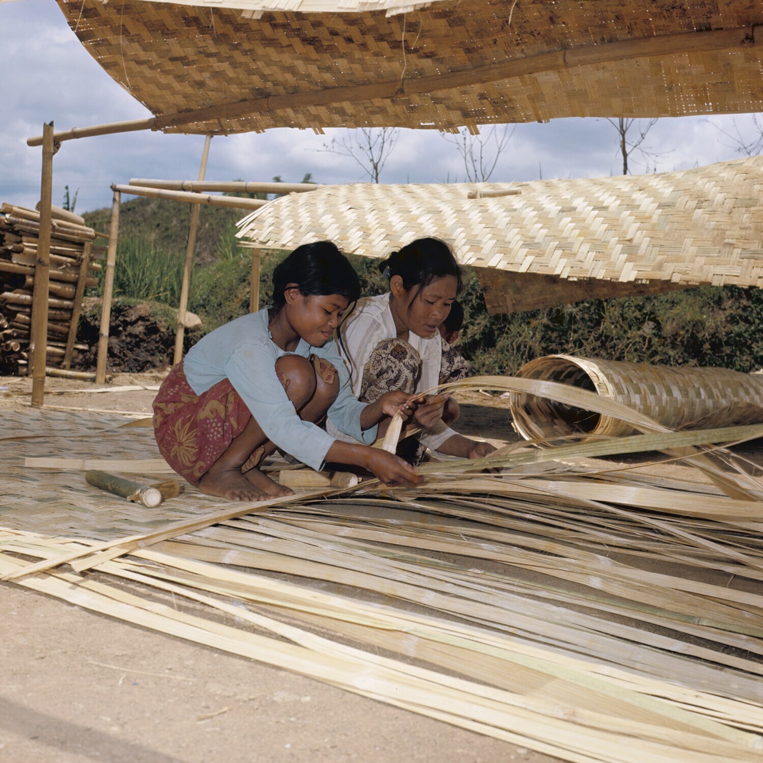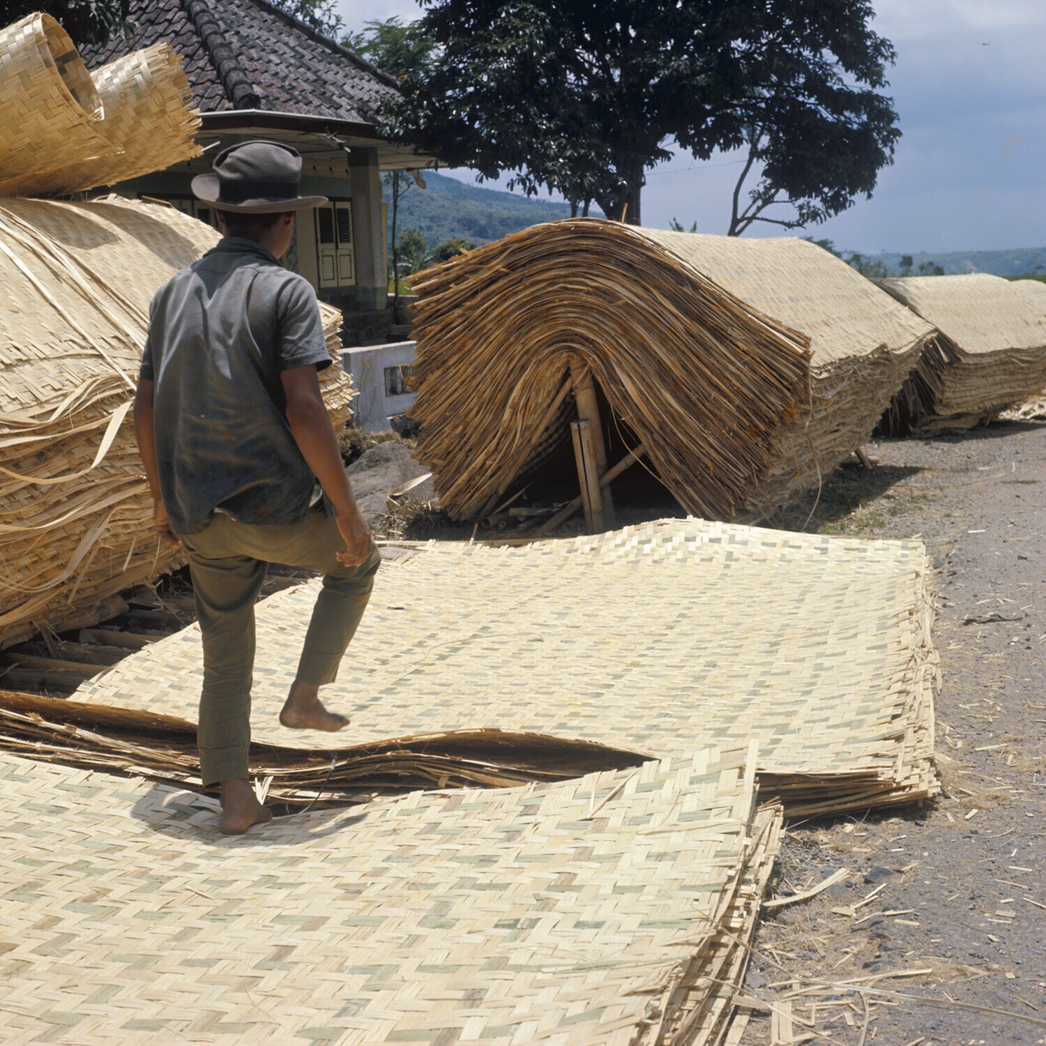 Vlechten van bambustrips als dakbedekking (gedèk)