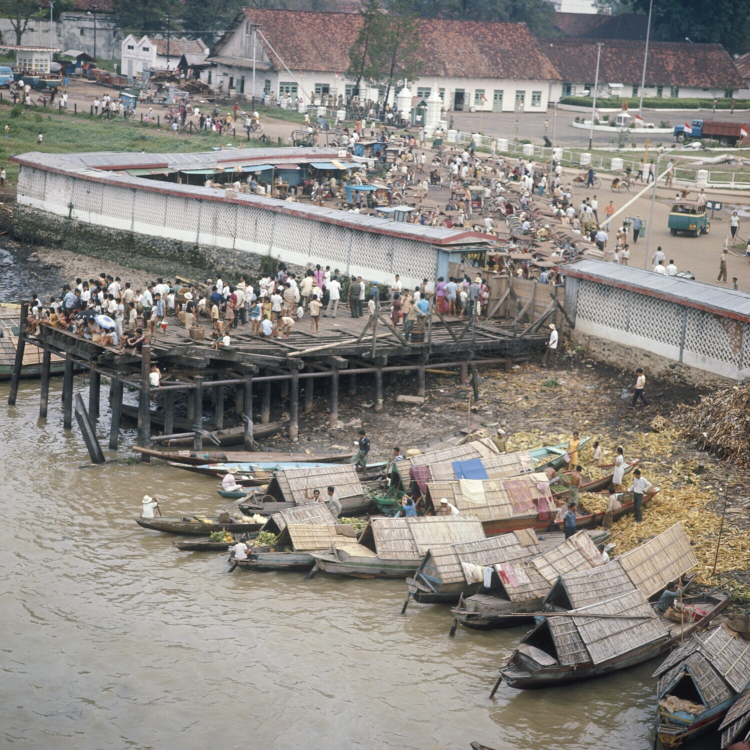 Prauwen bij een steiger, Palembang