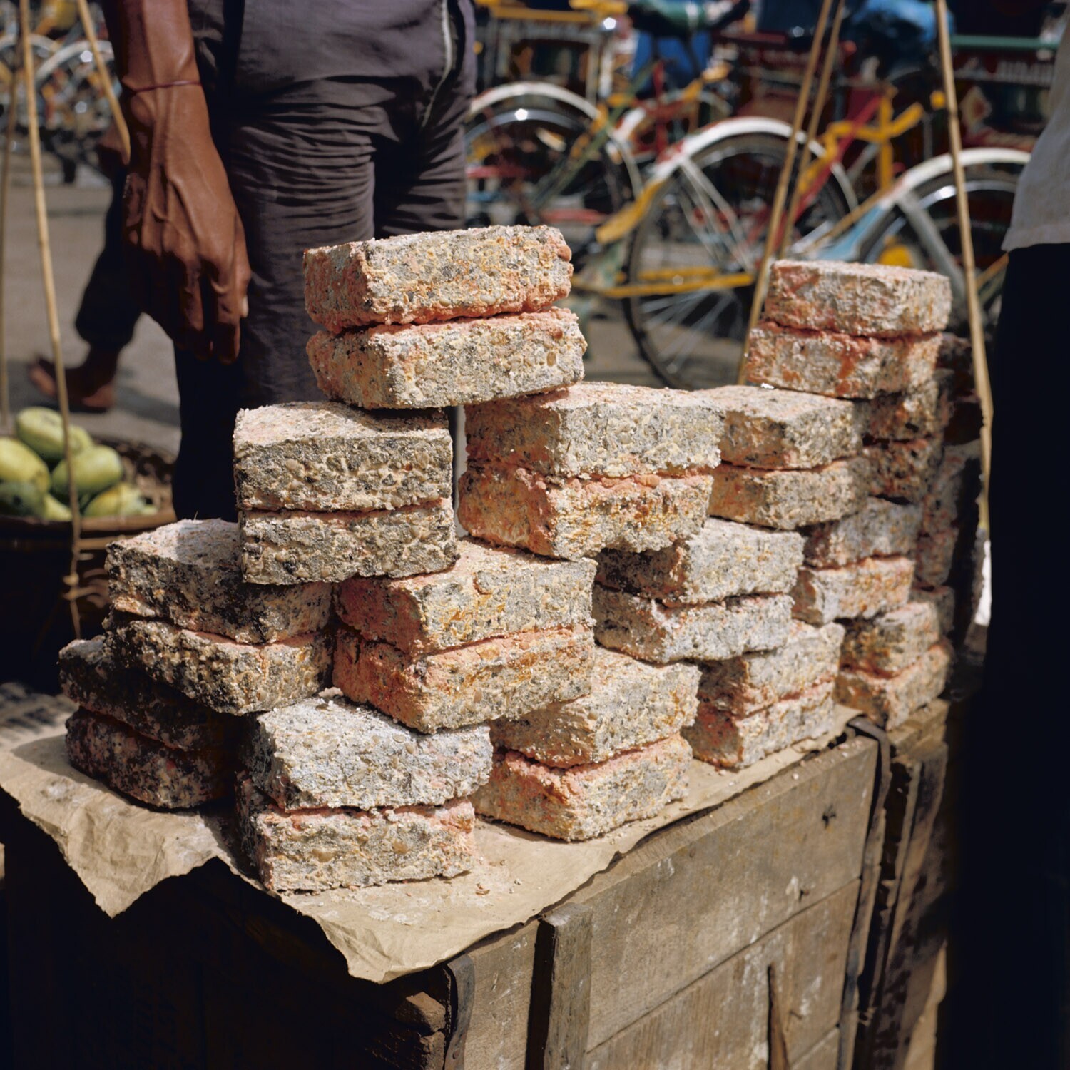 Verkoop van ontjom (sojabonen met schimmel)
