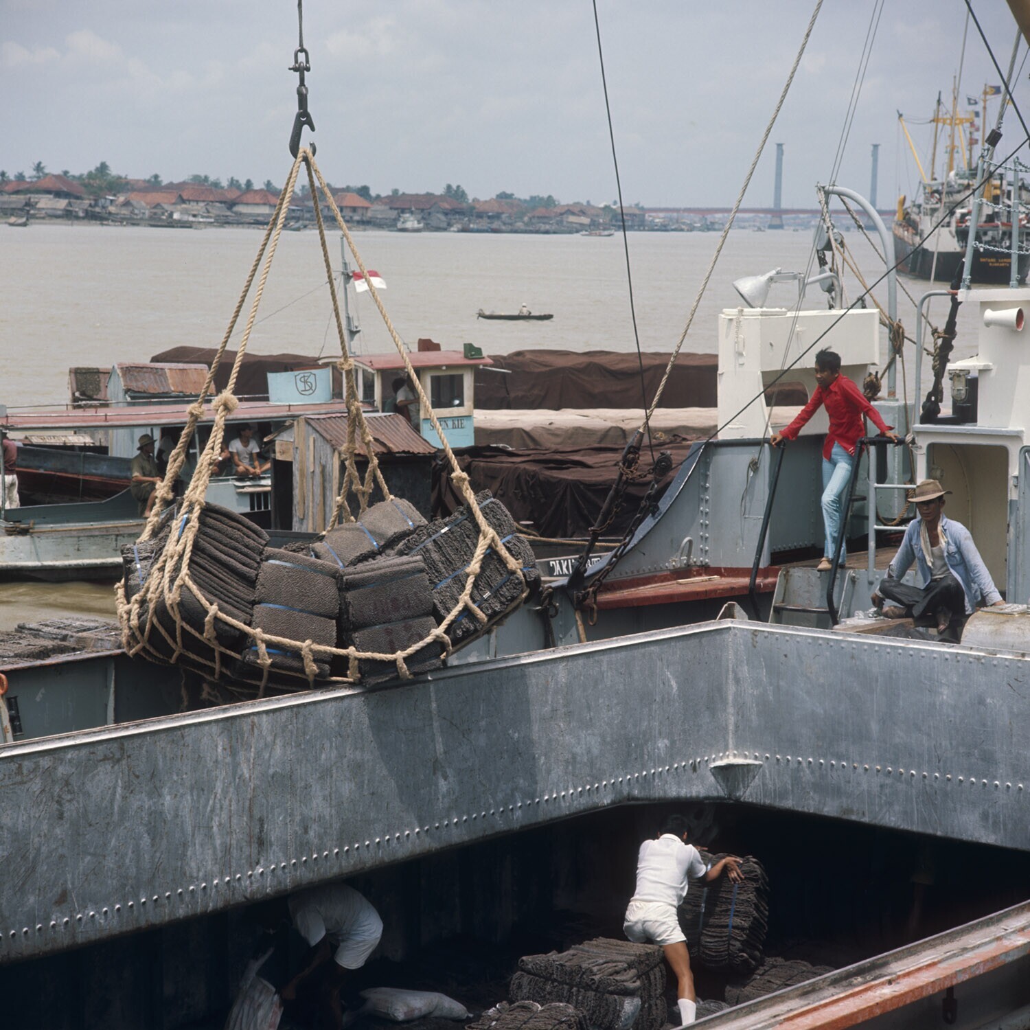 Inladen van rubbersheets op een schip in Palembang