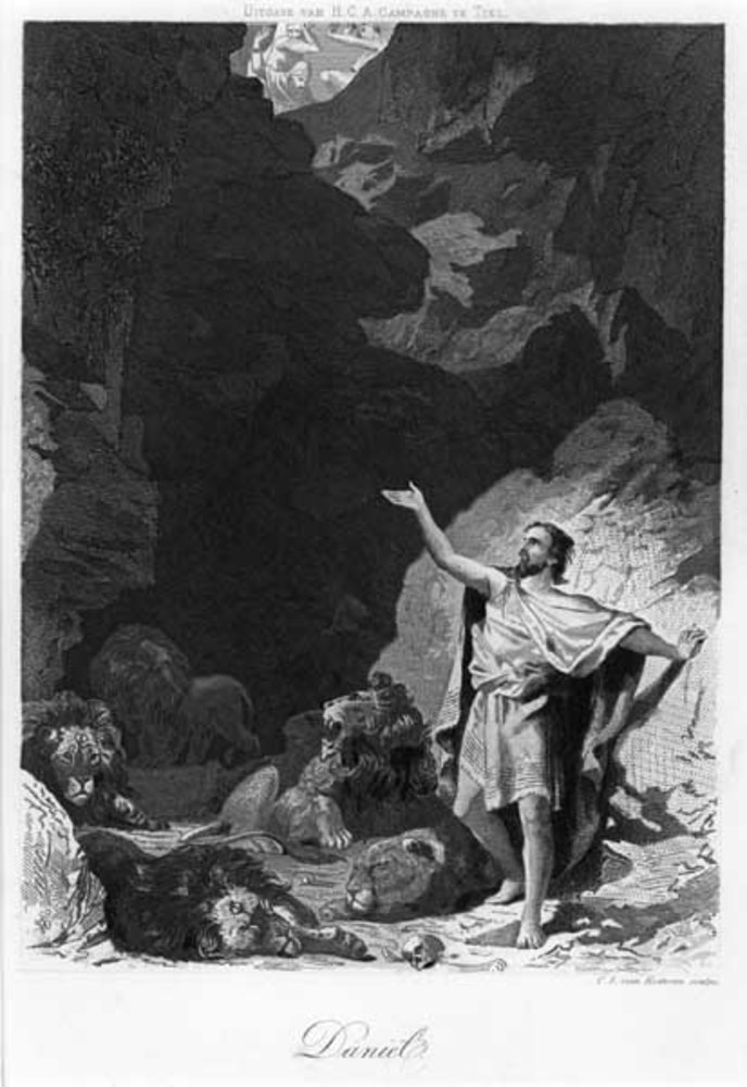 Gravure, voorstellende Daniël in de leeuwenkuil, ver...