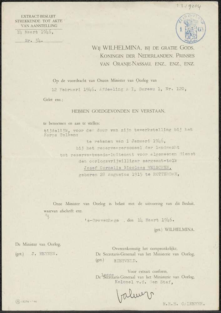 Oorkonde dat oorlogsvrijwilliger Sergeant tolk J.C.N...