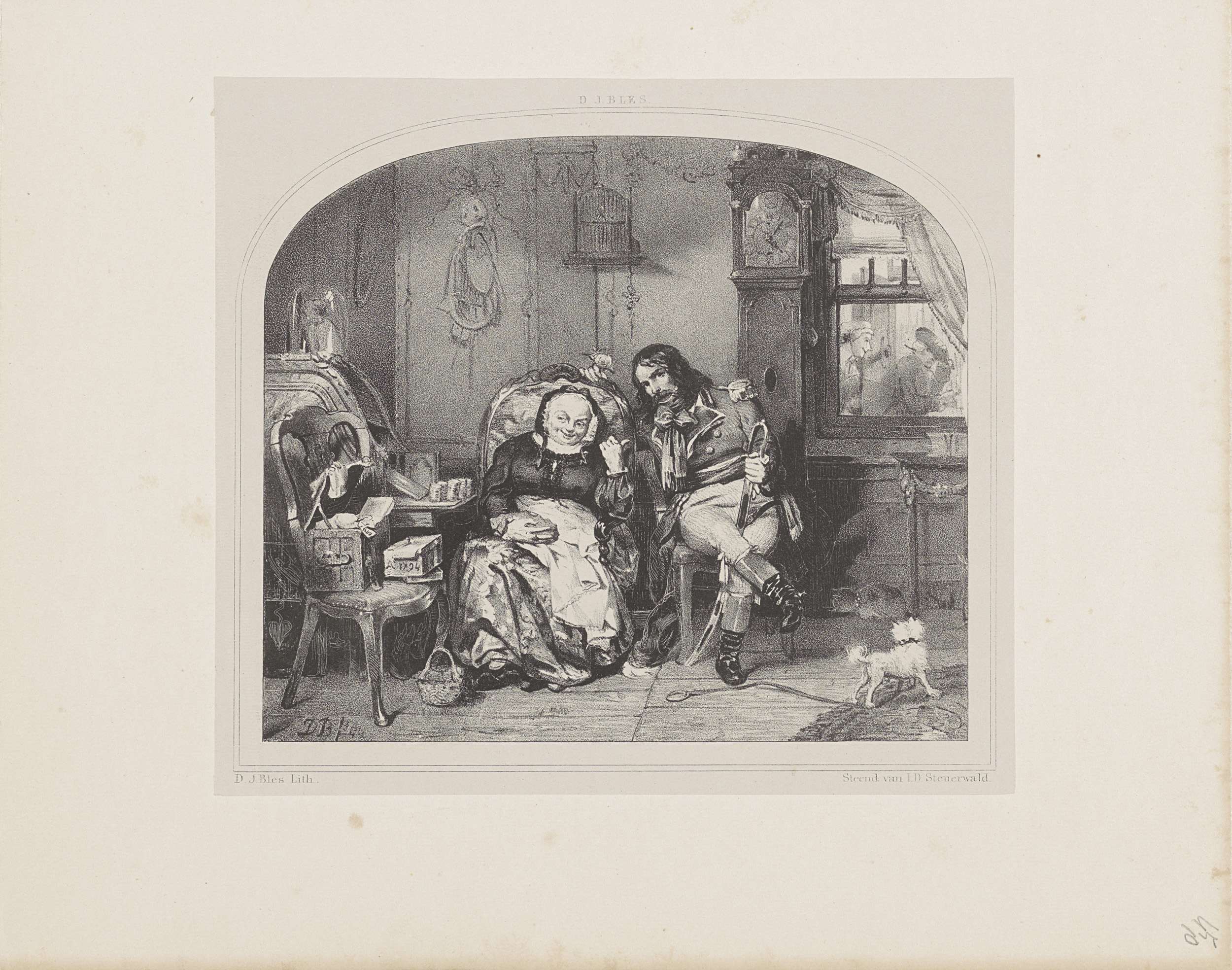 Interieur met soldaat en oude vrouw