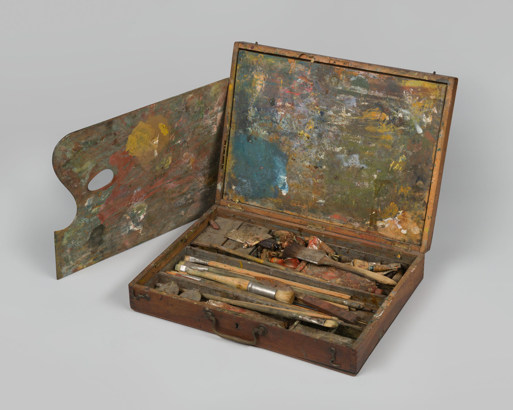 Schilderkist met kwasten, palet en tubes