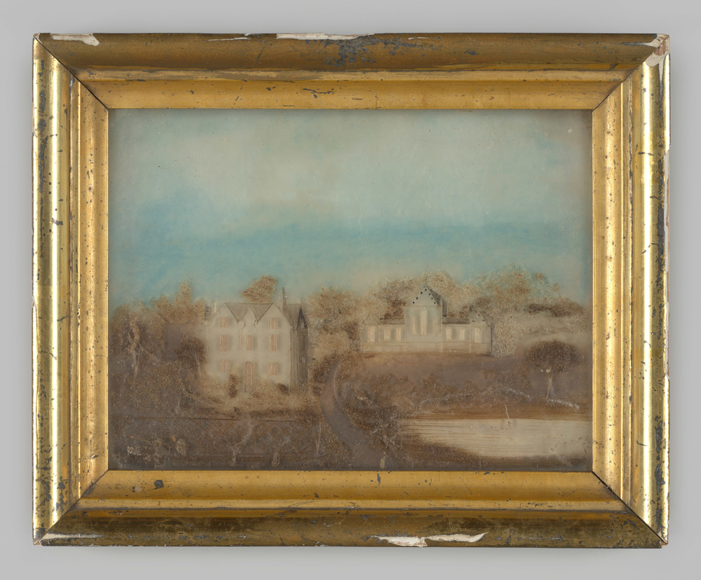 Achterglasschildering van een huis met bijgebouwen e...